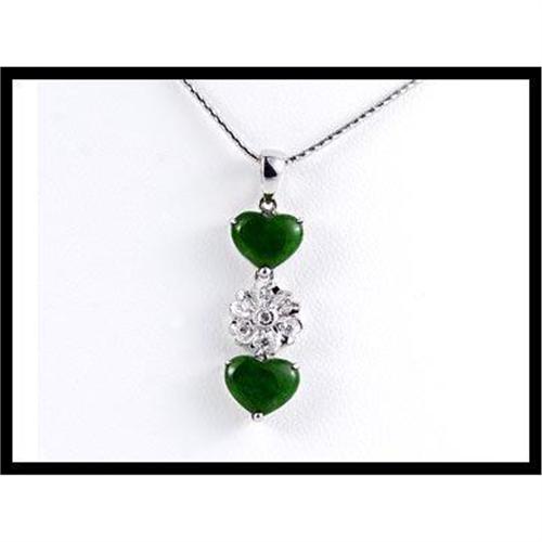 This adorable pendant will draw a smile! Set in 18K white gold, the pendant features 2 heart shaped green jades and 7 full cut diamonds that weigh .12 carats TW.