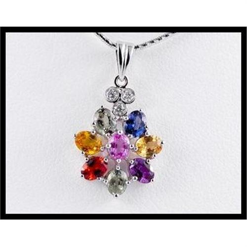 This captivating pendant has a superb design with a rich range of colors. 8 oval cut multi-color sapphires that weigh .72 carats and 3 full cut diamonds are set in 18K white gold. The pendant measures with bale 23 millimeters (29/32 inches) x 13 millimeters (1/2 inches).