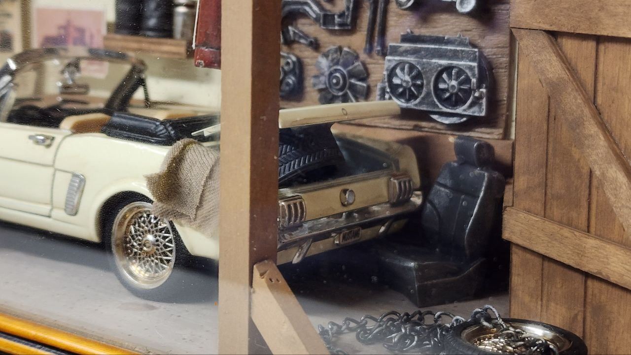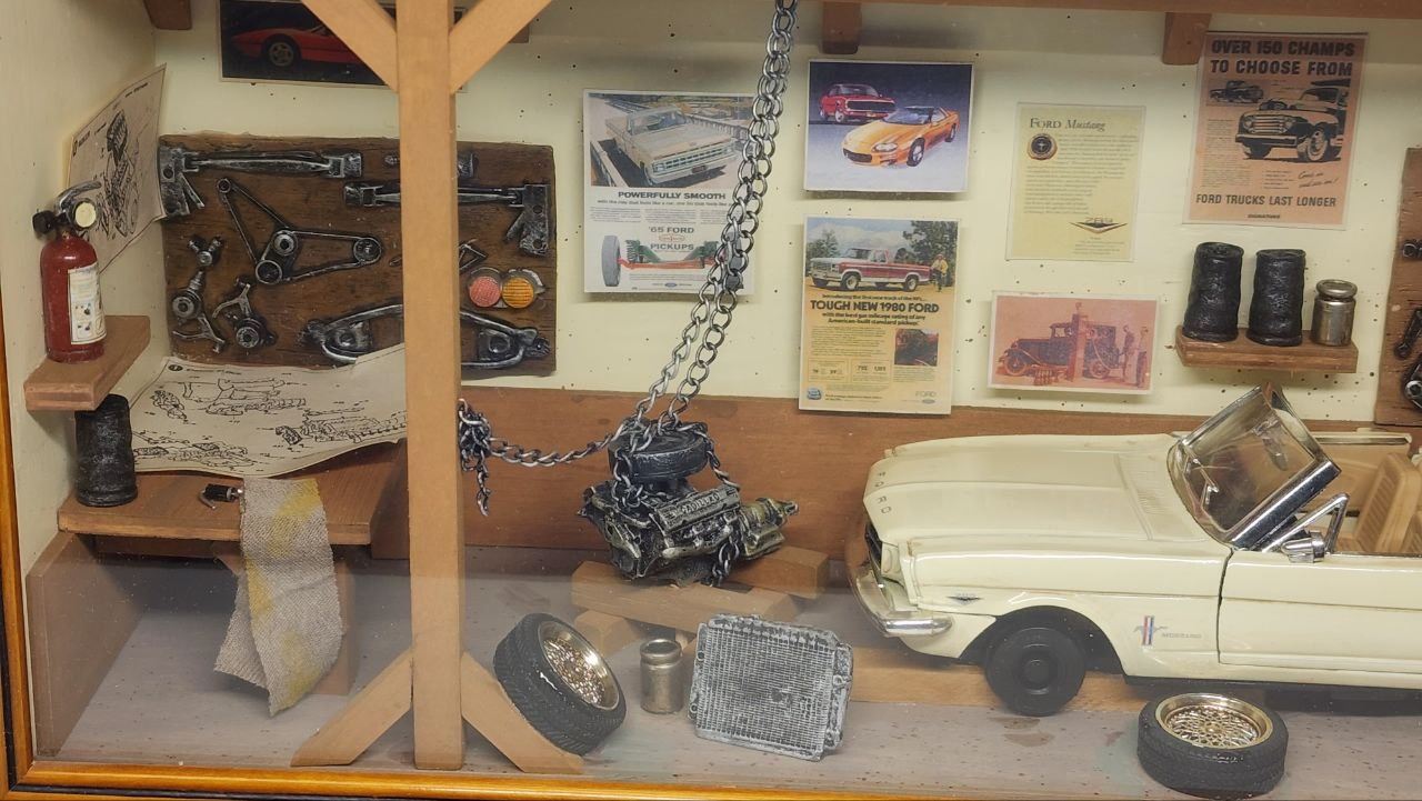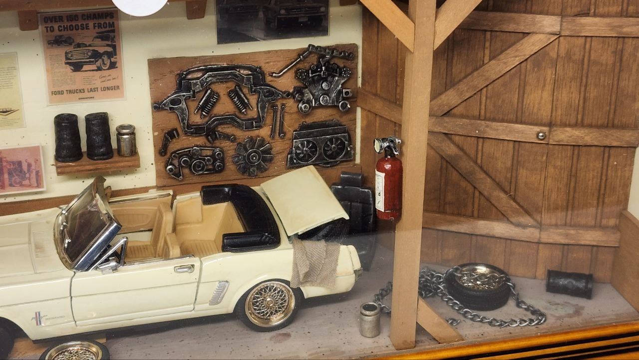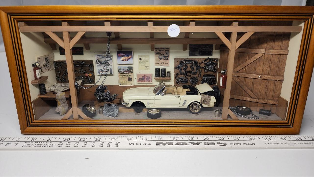 UNIQUE - 30 year old collector item: Wooden SHADOW BOX GARAGE featuring 1964 Mustang undergoing repairs