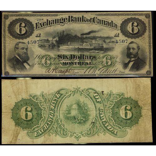 "UNIQUE $6 NOTE" The Exchange Bank of Canada 1872 $6 #4507 CH-245-10-06 Fine-15. No other example are known! Of the hihest rarity. A museum piece. Worth a premium bid. Expect strong bidding.