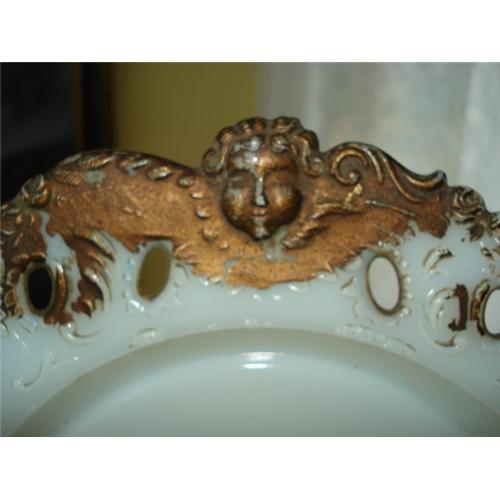 Beautiful Victorian heavy antique milk glass plate with gorgeous high relief gilded angels or cherubs surrounding the openwork border of the plate. When held to light you can the reddish pink fire (tried to capture this in one of the images, you can make out the fire by the openwork) The plate is amazingly haunting looking and makes a beautiful presence. It measures about 9 inches across and is in very nice condition, although the gold trimming has rubbed off it gives the plate an even more interesting appearence! Would be lovely to use during the Holiday Season!