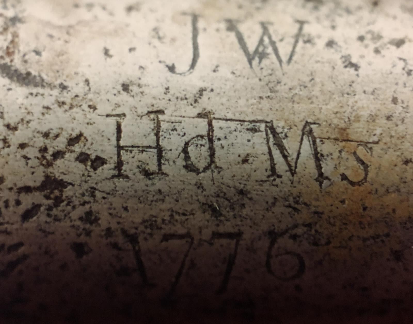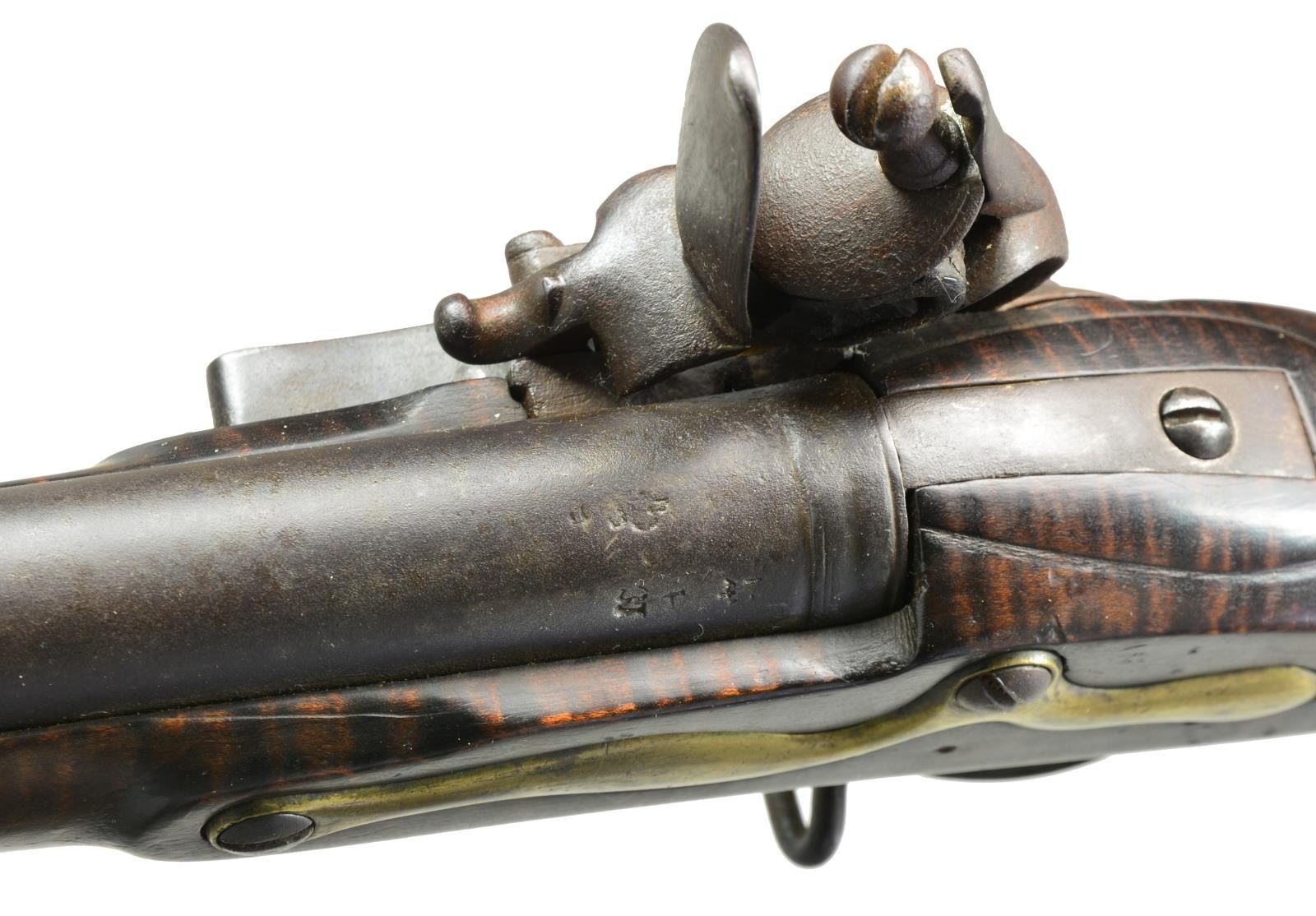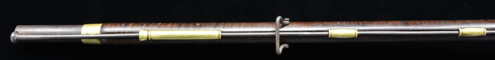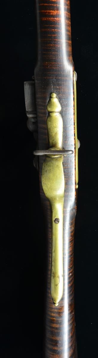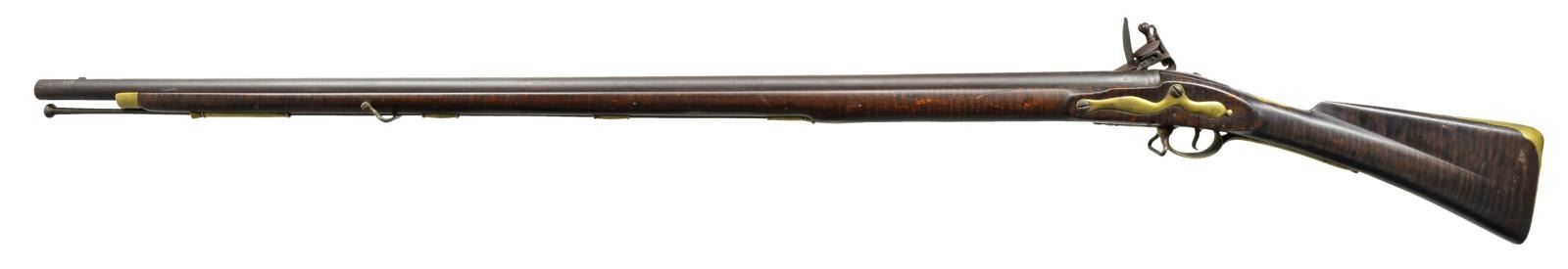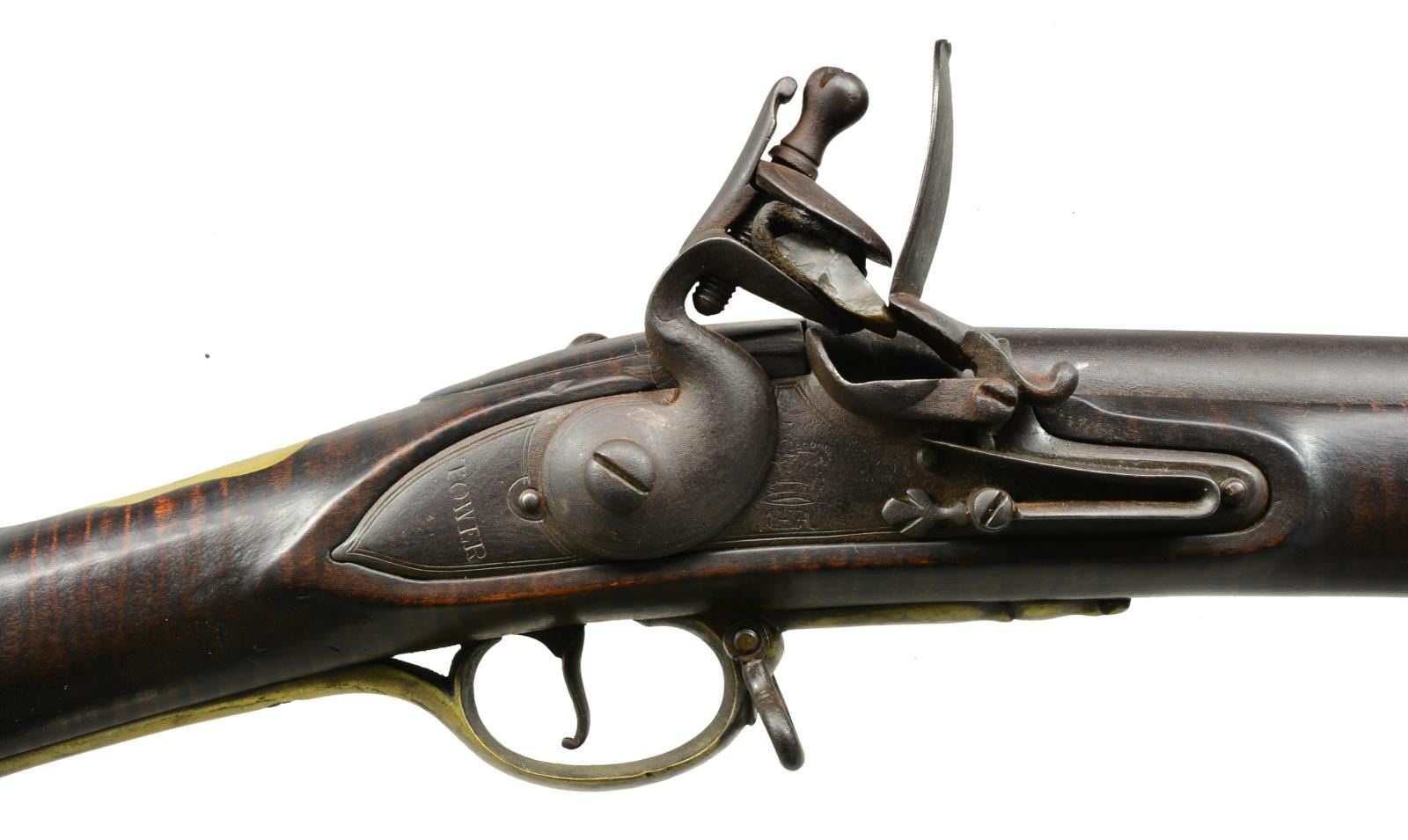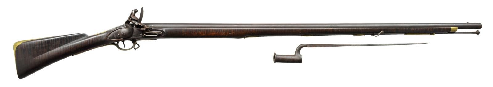 BY JOSEPH WETHERBEE, 1776. Cal. 79. NSN. 61 1/2" Overall. Bbl. 45 1/2". This unique brown Bess musket is documented & photographed in a 5 page article published in October 1971 Gun Report. Metal parts are all 1st model Brown Bess, the stock is curly maple. Engraved on the underside of the bbl., near the breech reads: “JW / Hd. Ms / 1776”. UNATTACHED ACCESSORIES: the 5 page 1971 article by Willard C. Cousins is available to anyone wanting to read the history of this musket. The article also showed an accompanying 18" bladed bayonet which was lost from the estate, a similar unmarked Brown Bess bayonet w/ 17" blade accompanies musket now. REFERENCE: pictured & described in Gun Report article: JOSEPH WETHERBEE PATRIOT-GUNSMITH, HARVARD, MASS 1725-1809, October 1971, pps 56-60. CONDITION: very good to fine overall, stock shows little wear or use & appears most likely 20th century addition, but 1776 inscription on bottom of bbl. appears original. Iron has brown patina overall, brass cleaned w/ light mustard patina, there is a braised repair in the top buttplate tang. Accompanying bayonet is very good & matches musket well. PROVENANCE: Ex-Willard C. Cousins collection. From the Collection of John "Tim" Breth Jr. (1897-1980). (01-17803/JS). ANTIQUE. $4,000-5,000.