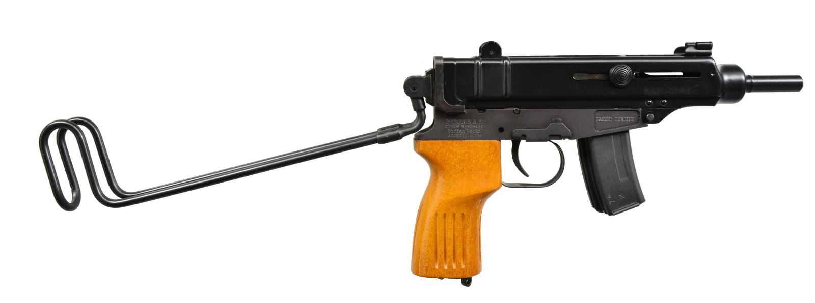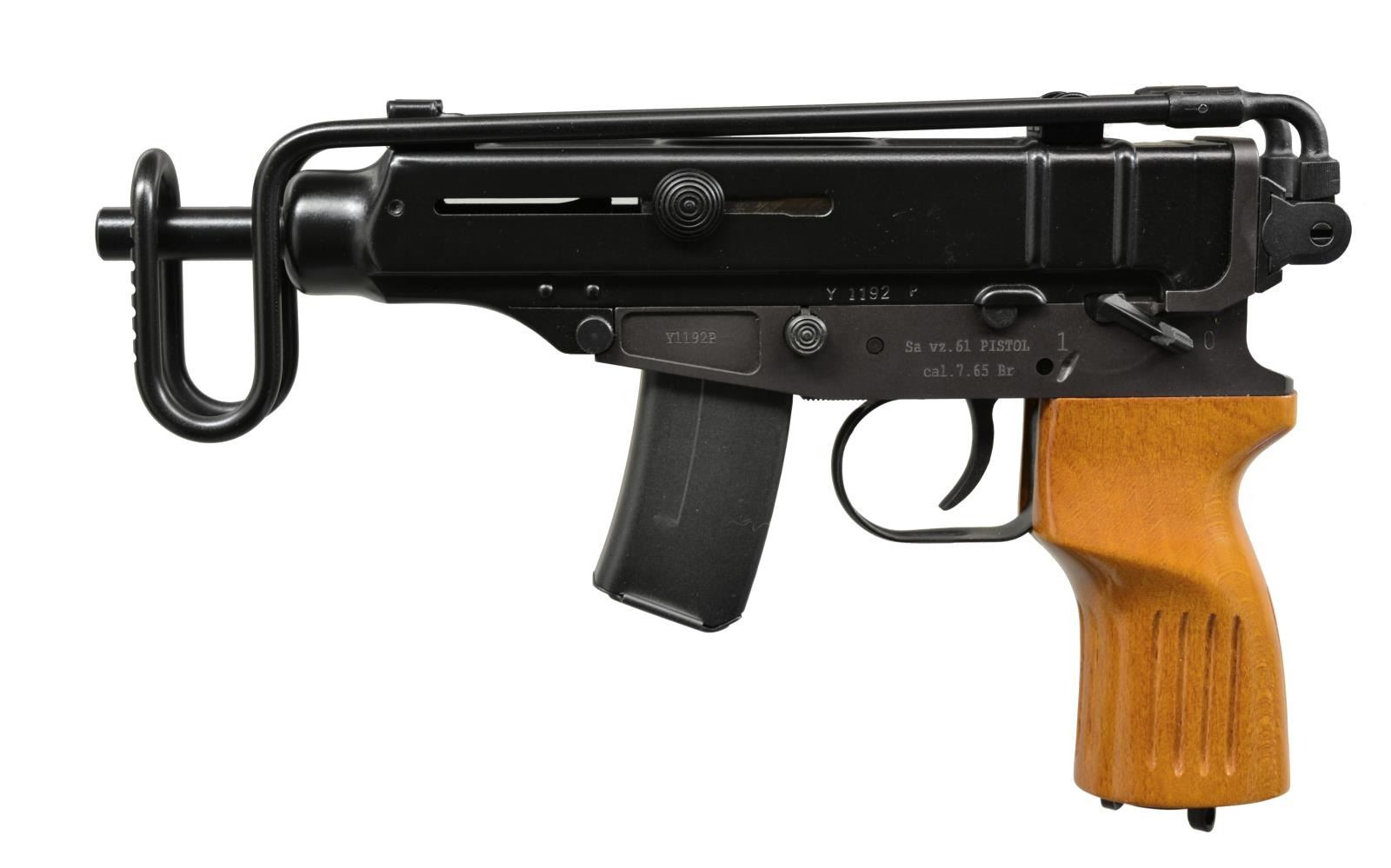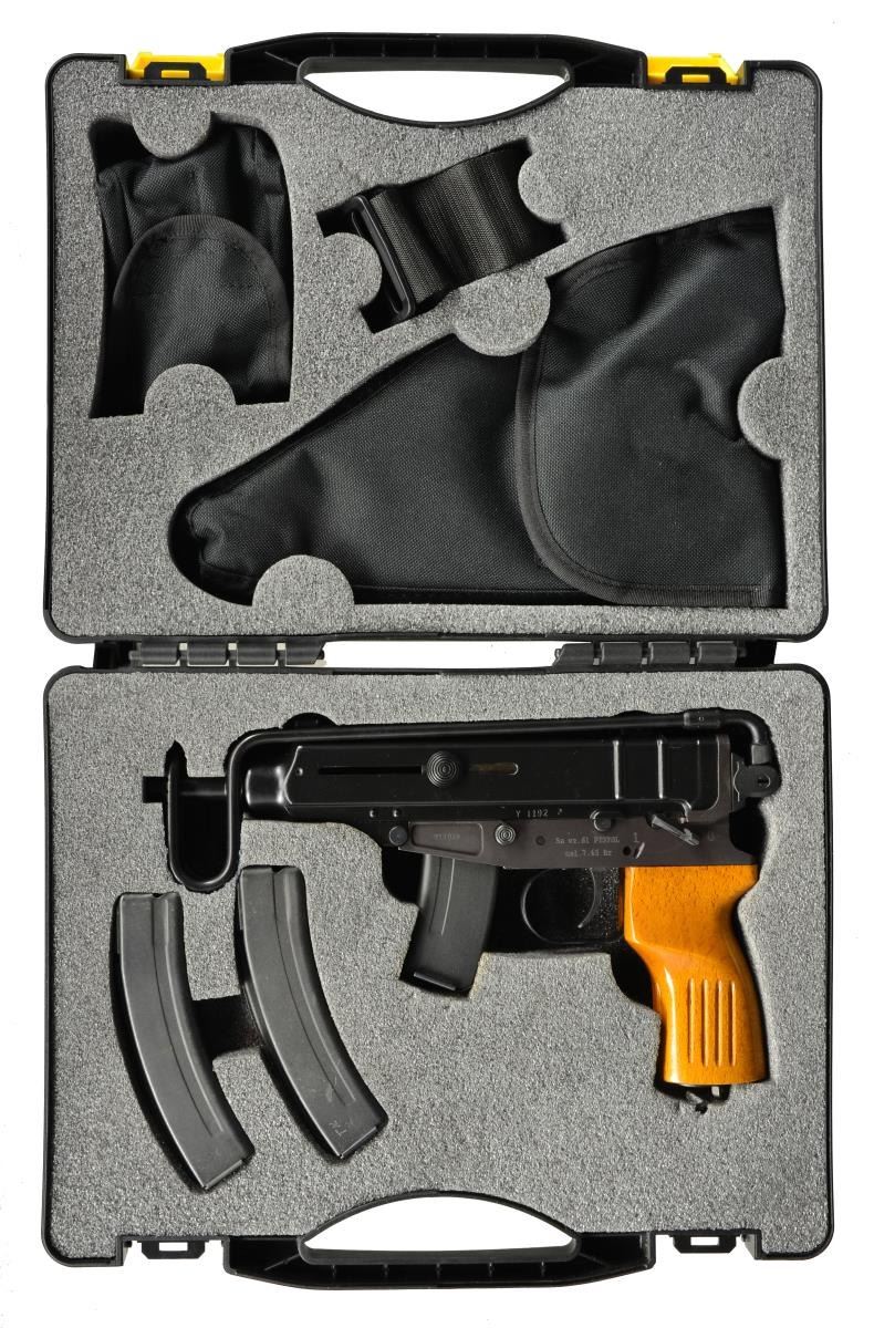 Cal. 32 ACP. S# Y1192P. Bbl. 4.5". Due to the 1968 Gun Control Act, combined w/ the 1986 National Firearms Act, the ability to own a foreign SMG is all but impossible. The SA VZ 61 Skorpion is an SBR variant that is as close as we can get for individual ownership. Designed in the late 1950’s, adopted by the Czech Military in 1961, the original VZ 61 is a true Czech machine pistol, chambered in 32 ACP. It has a cyclic rate of approx. 850 RPM & is fed from 10 rd. or 20 rd. detachable mags. The SA, or semi auto version, imported through Waffen Werks in Knoxville, TN. It retains a great portion of the aesthetics of the SMG including the top folding stock & telltale wood pistol grip. The SA version was available w/ 4 options, giving the owner the ability to choose between beech, walnut or plastic, as well as the traditional light standard grip. W/ the provided bbl. length, the average standard muzzle velocity is 1040 fps, making it a desirable suppressor host w/ the addition of an after market threaded bbl. The SA packaging is more of a kit than a simple box, including multiple accessories. Metal finish is a dark black on the upper receiver & bbl. assembly w/ a muted matte black finish on the lower receiver & mags. The stock is utilized by tapping it up w/ the non-control hand, releasing it from a spring loaded clip. When it is fully extended, it locks into place by a spring loaded rotating cam. To release the lock & return it to the folded position, the stock rails are squeezed to the center, just behind the receiver & it is rotated over the top, then snapped back into place. It may be operated w/ the stock in both open & closed positions. Front sight is a fixed post, while rear sight is a 2-position notch sight marked at 75m & 50m respectfully. The operating system is a closed bolt blow back design. The safety/selector is located in the left side & can easily be operated w/ the control hand thumb. Charging is accomplished by pulling back 2 ears that reside on either side of receiver. MAGS: 1-10 rd. & 2-20 rd. UNATTACHED ACCESSORIES: factory plastic transport case. Nylon & velcro holster couch. Nylon sling. Nylon & velcro mag. pouch that holds 2-20 rd. mags. 2 Compact disc digital user guides. CONDITION: finish on exterior metal surfaces is complete & consistent throughout. No noticeable blemishing beyond unavoidable daily handling marks. The only significant thinning is in areas of mechanical intervention. Wood grip is unblemished & stock locks tight in both open or closed position. Fire control mechanism appears to function correctly when cycled by hand. Bore is shiny w/ good rifling. PROVENANCE: Formerly owned by the Consult General of Pakistan. NATIONAL FIREARMS ACT SBR REQUIRING BATF TRANSFER BEFORE TAKING POSSESSION. FULLY TRANSFERABLE. (03-1462/JZ). MODERN CLASS III. $1,000-1,500.