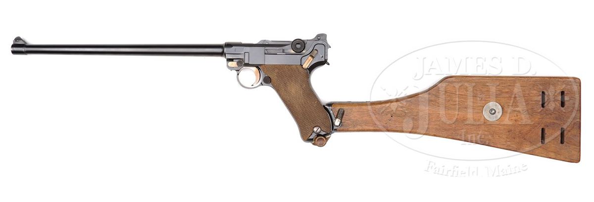 SN 9384. 12" 30 Cal. bbl that is matching numbered and Crown/N proofed. "DWM" scroll on center toggle link. 100m/200m rear Navy style sight. Crown/N proof on left receiver. "GERMANY" marked on front of right frame rail. Checkered wood grips. All numbered parts on gun are matching. Imperial proofed wood bottom magazine. With unique custom tan leather scabbard holding a commercial Navy stock that is attached to a custom tan leather holster with tan leather straps and buckles and extra magazine pouch. Stock has Navy Crown/M proofed metal disk and is missing the screws in the stock lug. Serial number on lug does not match the gun. Holster stock combination is well made and of the period and does not appear to have any identifying marks. This gun is featured on p. 532 of Dr. Geoffrey Sturgess' The Borchardt & Luger Automatic Pistols. PROVENANCE: Collection of Dr. Geoffrey Sturgess. CONDITION: Excellent retaining 98% orig blue and 97% orig straw. Bore is bright with light wear. Grips are very good with light wear and some chips in the checkering with a large chip in the left grip under the safety lever. Magazine has some minor chips in the wood bottom. Stock is excellent with minor wear. Leather on holster and scabbard is very nice with minor scuffs and cracks as are the straps and magazine pouch. Mechanics are excellent. 4-52101 BWS100