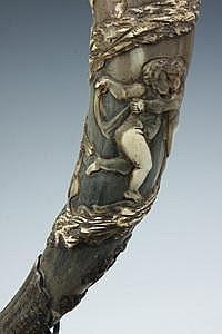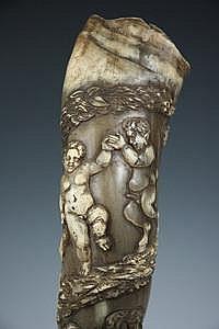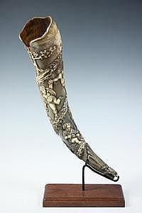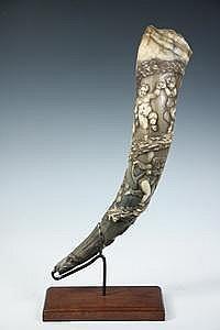 EARLY HUNTING HORN - 18th c. Carved European Hunting Horn, probably German, from an Ox horn, carved with spiral rank of dancing Putti, ending with an ancient elm, in the form of a~Horn-of-Plenty~ or Cornucopia, with Dragon-form tip and fluted opening, 19 5/8in overall, 3in x 3 7/8in end, on custom stand