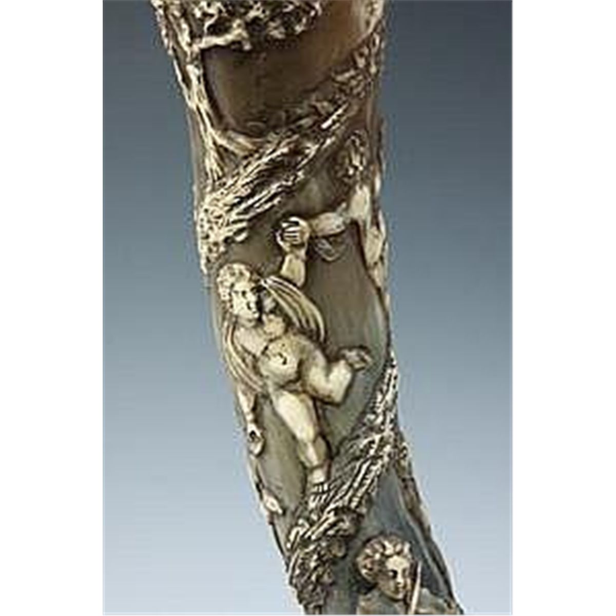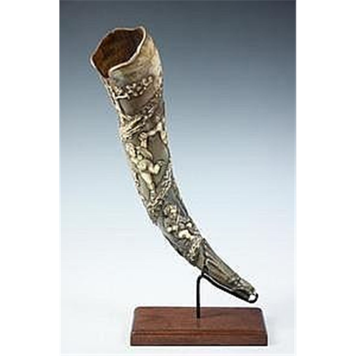 EARLY HUNTING HORN - 18th c. Carved European Hunting Horn, probably German, from an Ox horn, carved with spiral rank of dancing Putti, ending with an ancient elm, in the form of a~Horn-of-Plenty~ or Cornucopia, with Dragon-form tip and fluted opening, 19 5/8in overall, 3in x 3 7/8in end, on custom stand