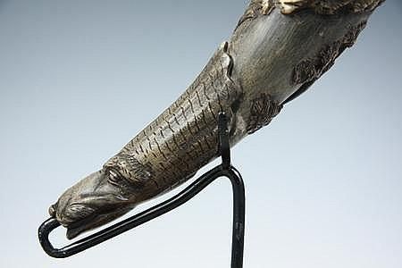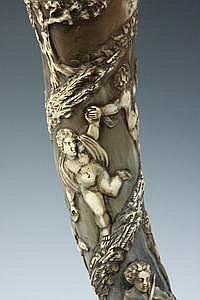 EARLY HUNTING HORN - 18th c. Carved European Hunting Horn, probably German, from an Ox horn, carved with spiral rank of dancing Putti, ending with an ancient elm, in the form of a~Horn-of-Plenty~ or Cornucopia, with Dragon-form tip and fluted opening, 19 5/8in overall, 3in x 3 7/8in end, on custom stand