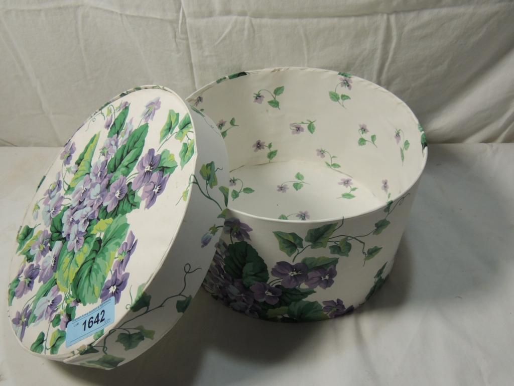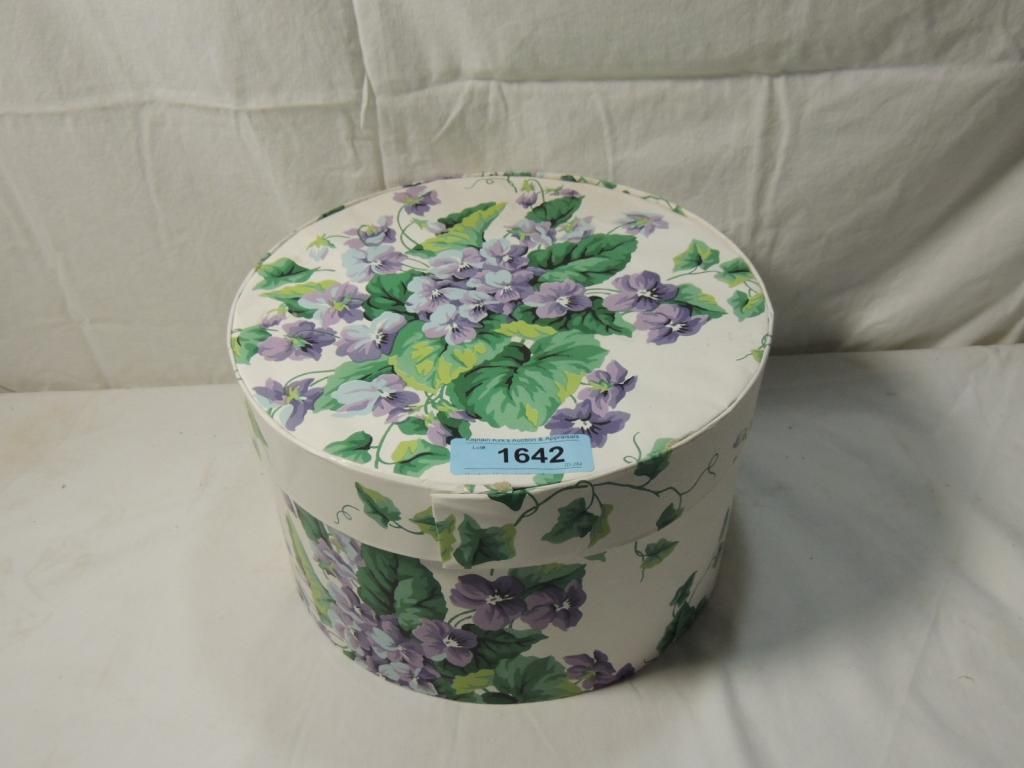 UNIQUE ROUND FLORAL HAT BOX GREAT FOR STORAGE AS SHOWN SEE PHOTO FOR MORE DETAILS.