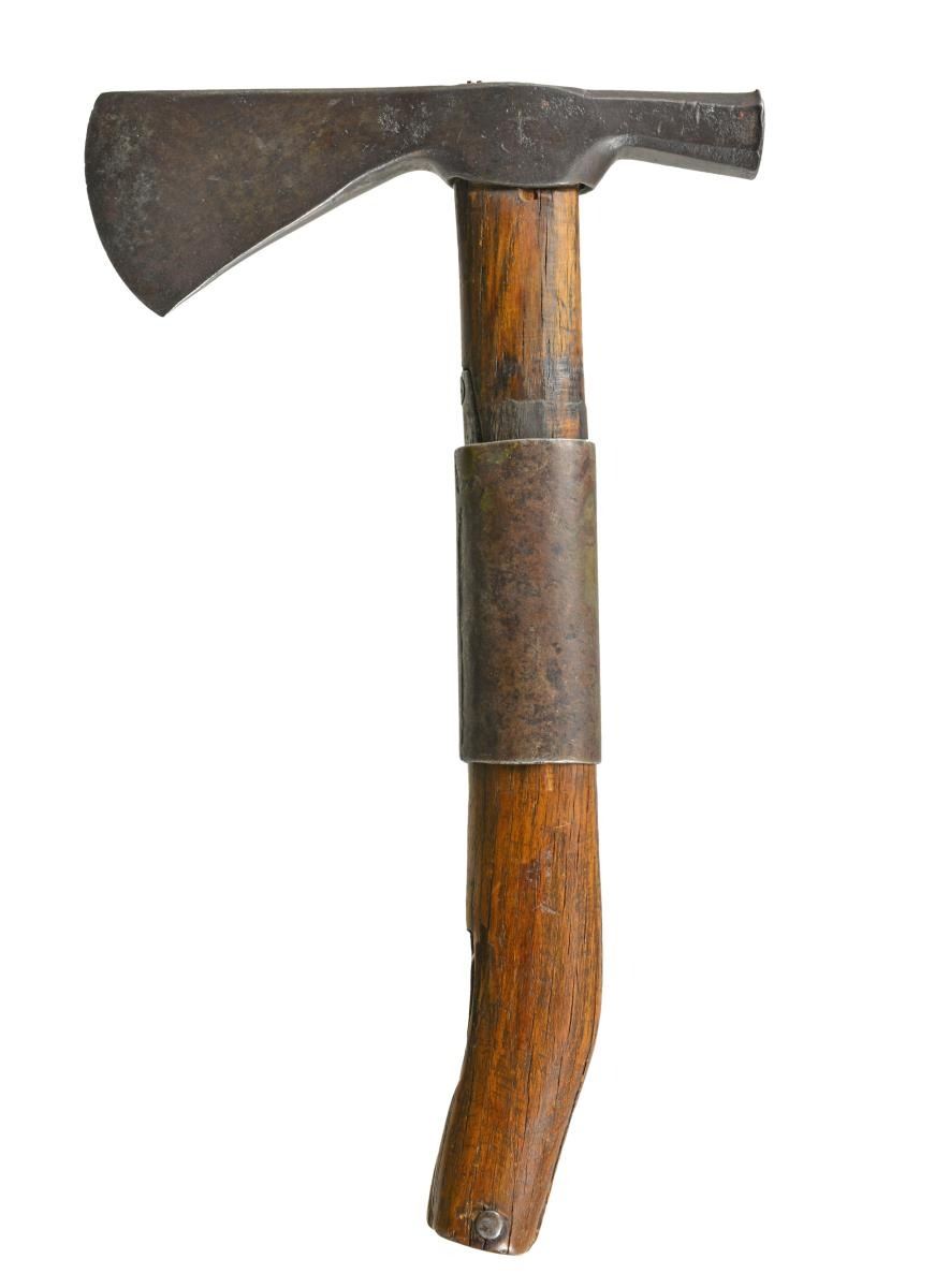 This exact knife is shown in at least 2 reference books, Hartzler Indian Tomahawks & Grant The Knife in Homespun America. Distinct solid poll folding tomahawk, haft is made in 2 pieces w/ about a 2" hinge & a 3" sliding iron collar. One side of the base of grip is angled & slotted to house the cutting edge & the grip is held together by a brass rivet. This is quite a piece of American ingenuity that could fit into a hunting bag, folding to 6.5" x 3", open haft is 11", blade 6.5". CONDITION: very good overall. PROVENANCE: From the Collection of John "Tim" Breth Jr. (02-13831-1/JS). $800-1,200.