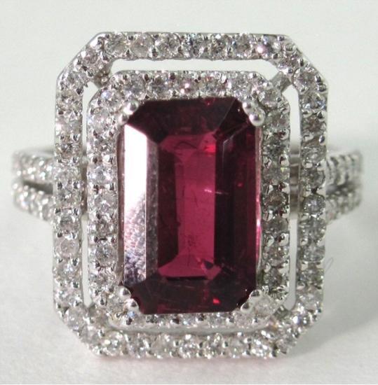 Ladys 14K White Gold Dinner Ring, with a 3.25 carat emerald cut rubelite, on a diamond mounted frame, above a larger diamond mounted frame, total diamond wt.- 1 carat.