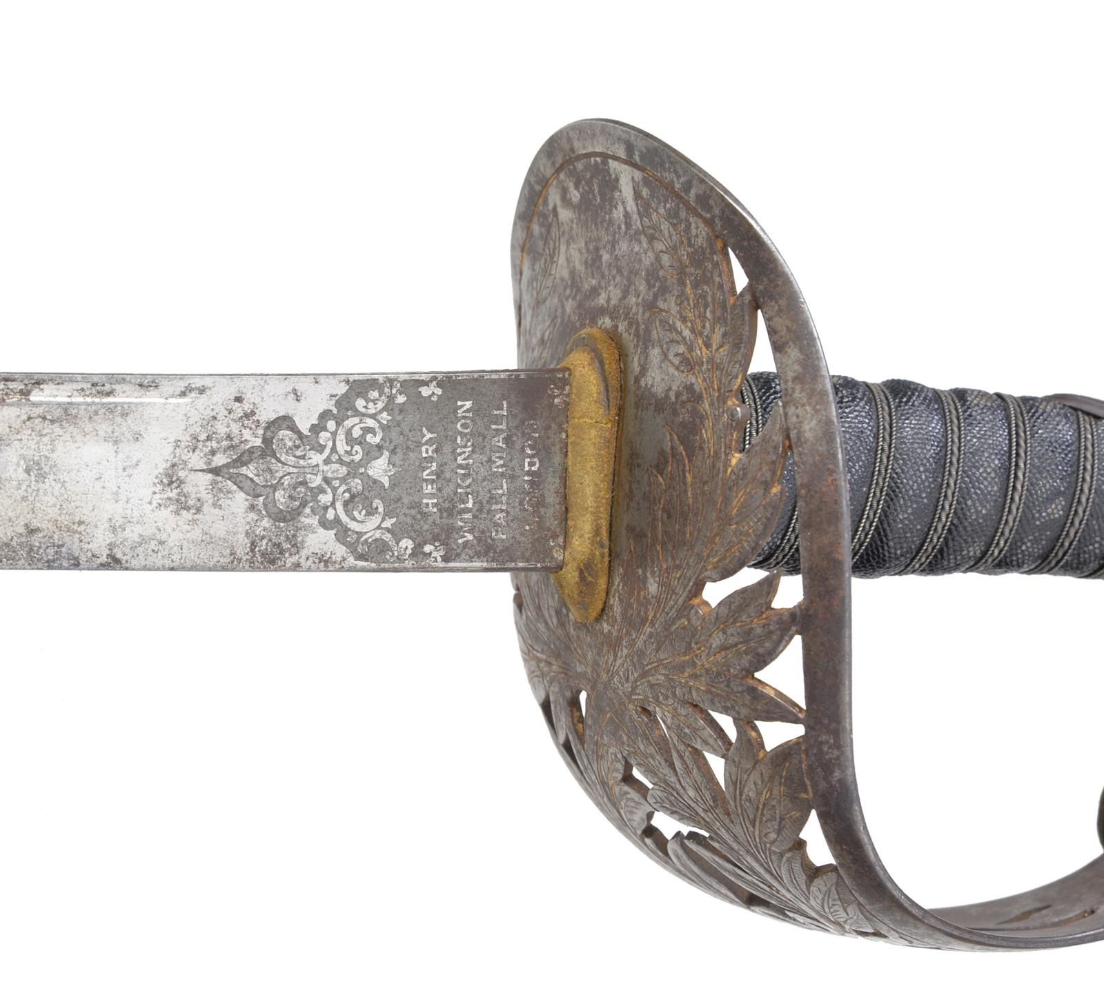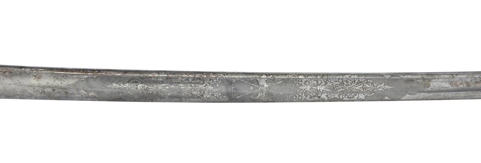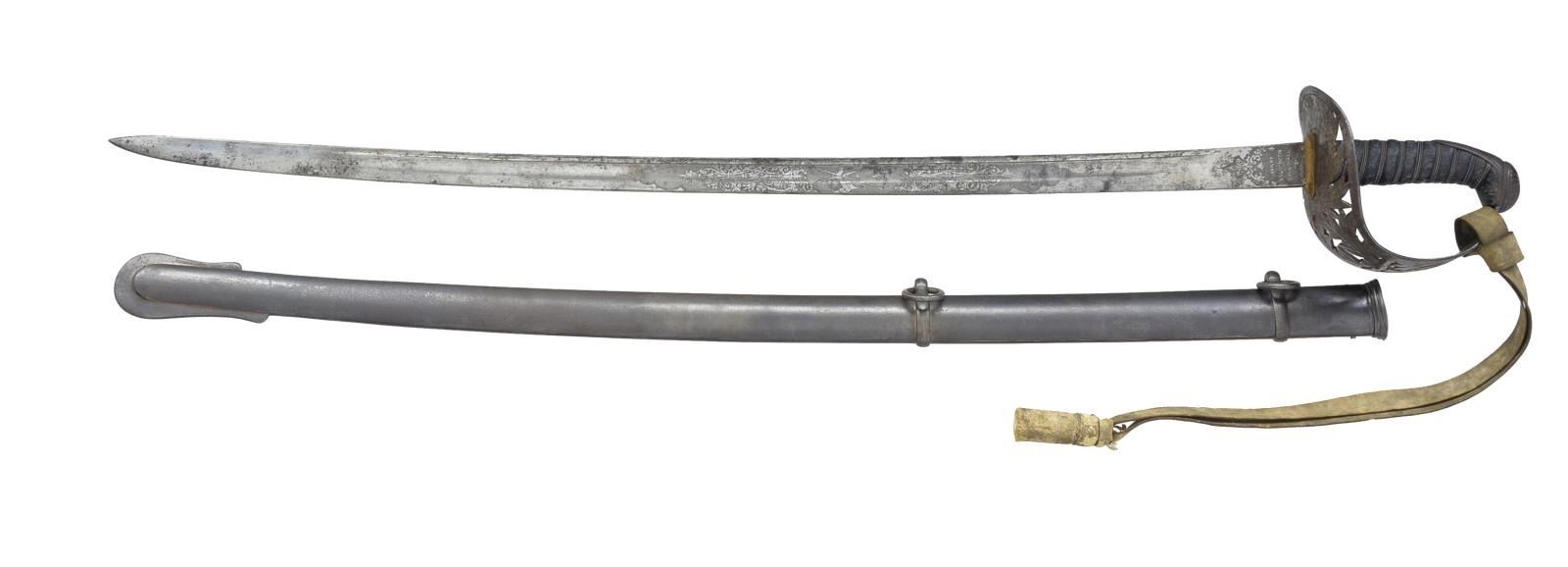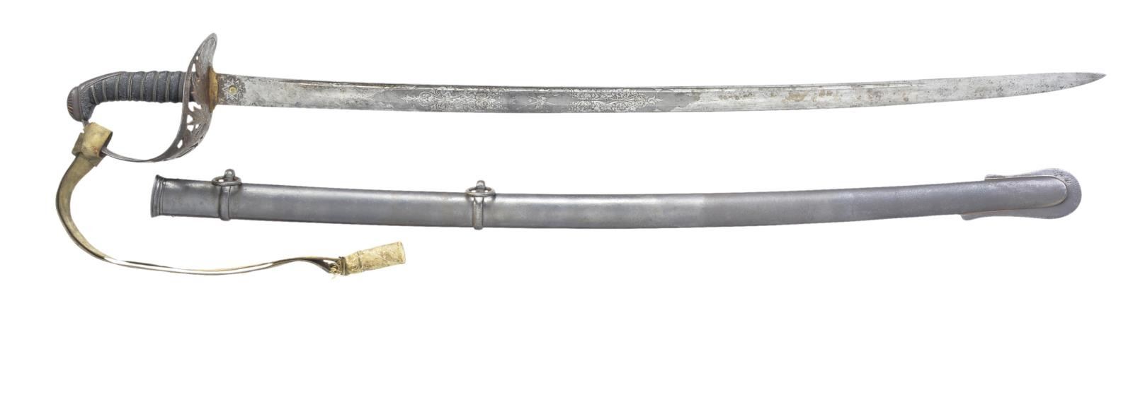 WILLIAM PORCHER MILES. (S# 11902). This sword is one of a handful made for Confederate officers by the English firm of Henry Wilkinson. Wilkinson’s swords had the reputation being among the best in the world. His swords of different patterns were purchased by soldiers of many countries, including the United States & Confederate States during the Civil War. The Miles presentation sword was delivered in London to Benjamin Franklin Evans, who was in London on behalf of the Confederate Govt. at the time. B. F. Evans is best known being a South Carolina lithographer making Confederate stamps & currency. This sword has unique 2” etched panel of 2 crossed Confederate First National flags w/ 12 stars in circle on each canton. William Porcher Miles was appointed to the First Provisional Confederate Congress in Montgomery where he headed the committee to design the flag for the Confederate States. The design accepted was the Stars & Bars, the same design on the crossed flags that appear on both sides of this sword. The first Confederate flag was hoisted in Montgomery, AL. March 4, 1861. By April, W. P. Miles was back in Charleston on General P. G. T. Beauregard’s staff. After the Battle of Manassas, the newly designed Stars & Bars were found too easily being confused w/ the Stars & Stripes in the smoke of battle; a new flag design was needed. Miles again was involved w/ Beauregard in the design of a new flag for battlefield use only which would soon be adopted that we know today as the St. Andrews cross used by the Army in Northern Virginia and Army of Tennessee. UNATTACHED ACCESSORIES: a large file of research materials accompany sword. CONDITION: very good to fine overall. 32 1/2" Blade retains much of its original luster & polish, 12” etched panels w/ central motifs of crossed flags over Miles. Pierced iron guard of the new pattern English officer sword has iron patina inside guard & gray mottled patina outside. Iron scabbard is overall dark gray w/ pitting. A thin buff leather sword knot is still attached. Shark skin & triple twisted wire grip wrap are complete & fine. (02-13602/JS). $40,000-60,000.
