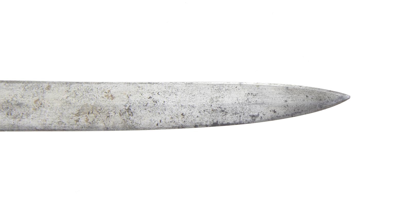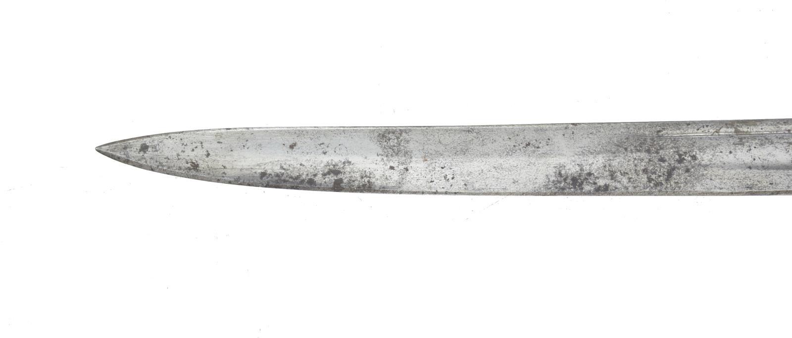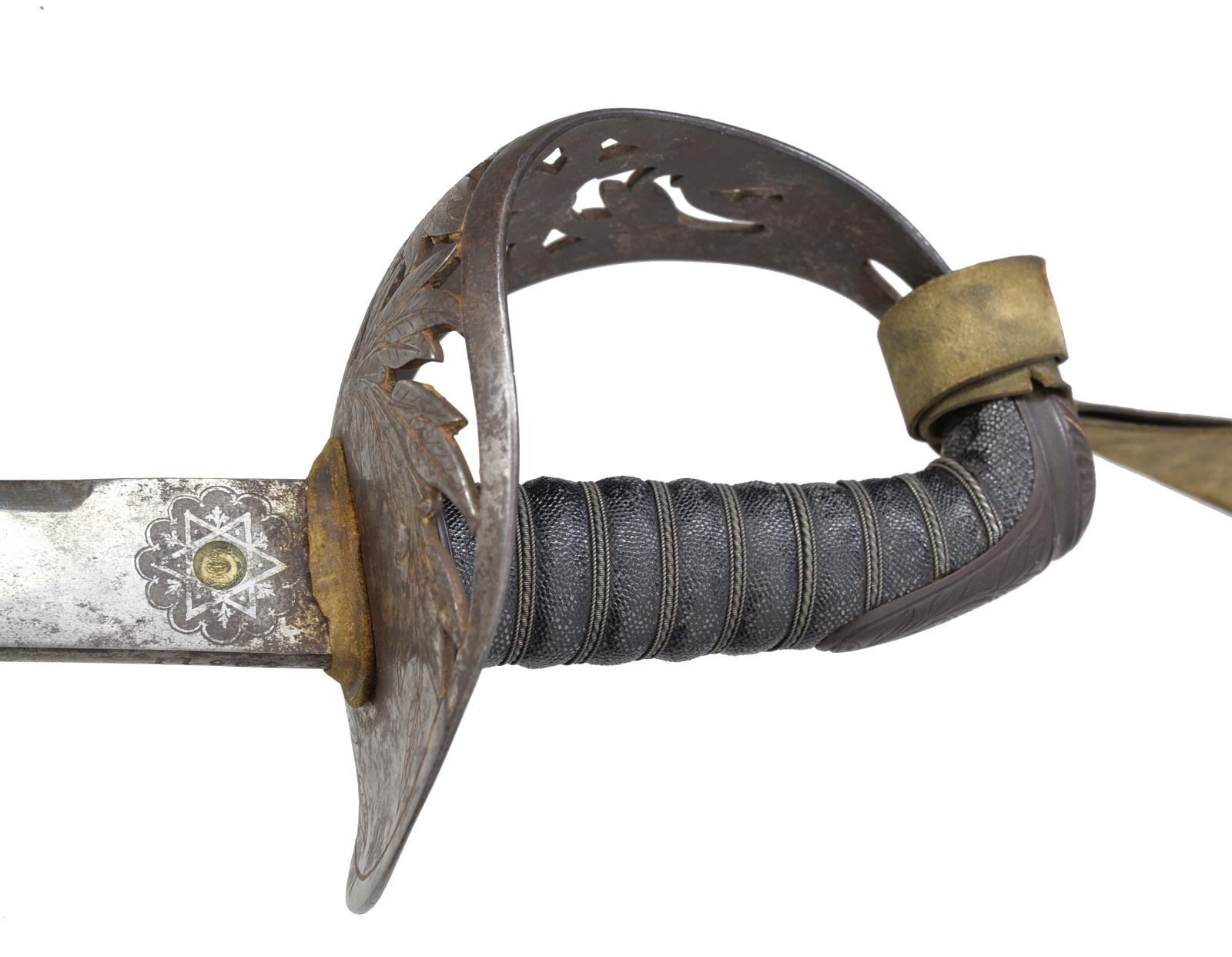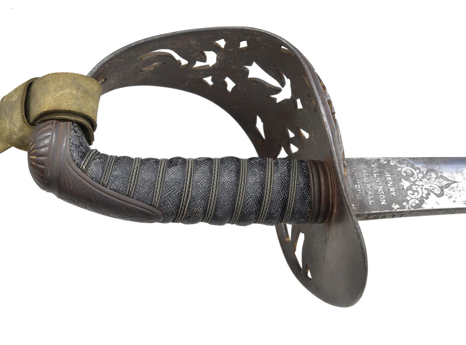 WILLIAM PORCHER MILES. (S# 11902). This sword is one of a handful made for Confederate officers by the English firm of Henry Wilkinson. Wilkinson’s swords had the reputation being among the best in the world. His swords of different patterns were purchased by soldiers of many countries, including the United States & Confederate States during the Civil War. The Miles presentation sword was delivered in London to Benjamin Franklin Evans, who was in London on behalf of the Confederate Govt. at the time. B. F. Evans is best known being a South Carolina lithographer making Confederate stamps & currency. This sword has unique 2” etched panel of 2 crossed Confederate First National flags w/ 12 stars in circle on each canton. William Porcher Miles was appointed to the First Provisional Confederate Congress in Montgomery where he headed the committee to design the flag for the Confederate States. The design accepted was the Stars & Bars, the same design on the crossed flags that appear on both sides of this sword. The first Confederate flag was hoisted in Montgomery, AL. March 4, 1861. By April, W. P. Miles was back in Charleston on General P. G. T. Beauregard’s staff. After the Battle of Manassas, the newly designed Stars & Bars were found too easily being confused w/ the Stars & Stripes in the smoke of battle; a new flag design was needed. Miles again was involved w/ Beauregard in the design of a new flag for battlefield use only which would soon be adopted that we know today as the St. Andrews cross used by the Army in Northern Virginia and Army of Tennessee. UNATTACHED ACCESSORIES: a large file of research materials accompany sword. CONDITION: very good to fine overall. 32 1/2" Blade retains much of its original luster & polish, 12” etched panels w/ central motifs of crossed flags over Miles. Pierced iron guard of the new pattern English officer sword has iron patina inside guard & gray mottled patina outside. Iron scabbard is overall dark gray w/ pitting. A thin buff leather sword knot is still attached. Shark skin & triple twisted wire grip wrap are complete & fine. (02-13602/JS). $40,000-60,000.
