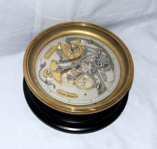 PIECE UNIQUE D'ECOLE. Chronographe compteur de démonstration de l'Ecole d'horlogerie de St. Imier, signée et datée l892, cadran en laiton argenté, mouvement acier et laiton doré, petit cadran auxiliaire pour le compteur minutes instantané, grosse aiguille des secondes au centre, un levier sur le côté permet d'effectuer les 3 fonctions, départ, arrêt, retour. Ø 215 mm