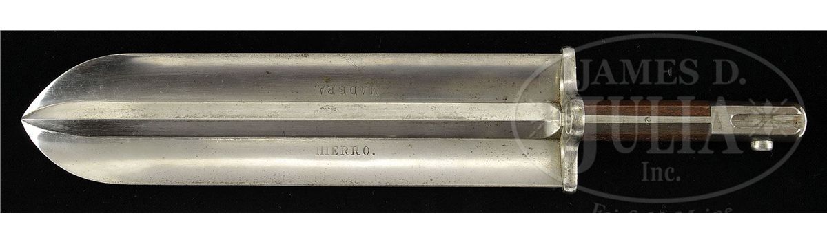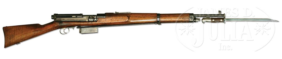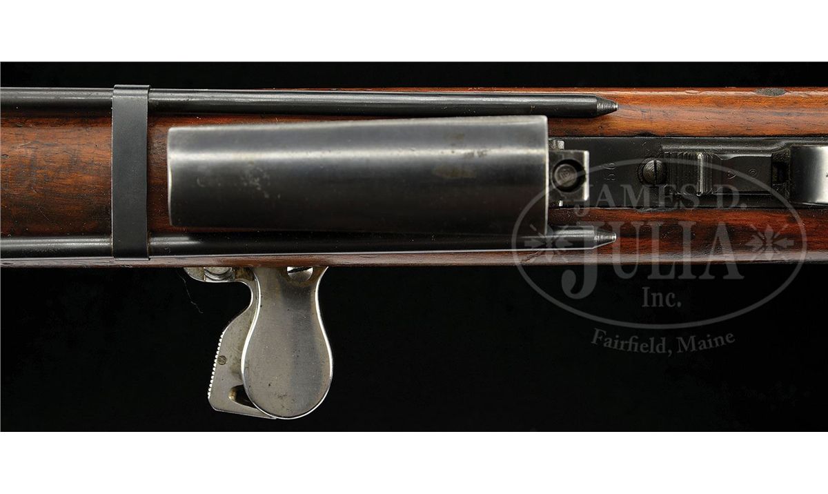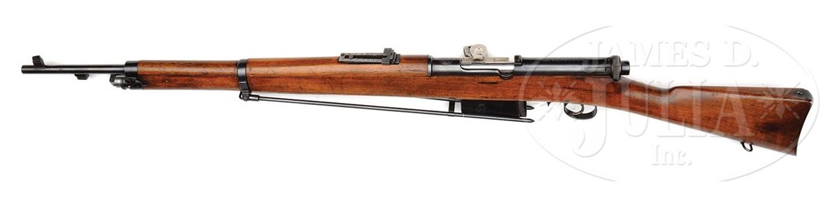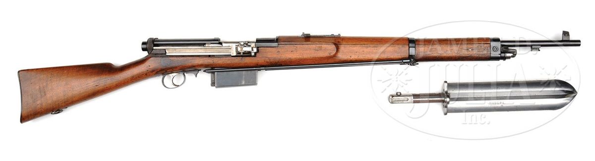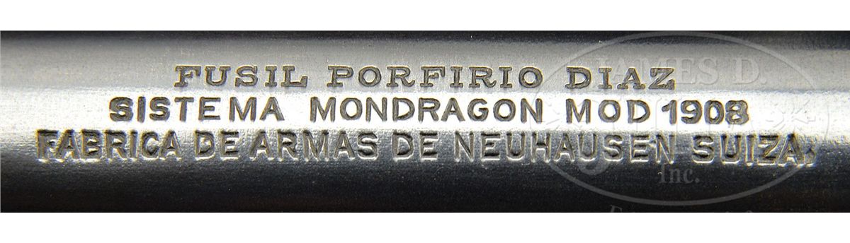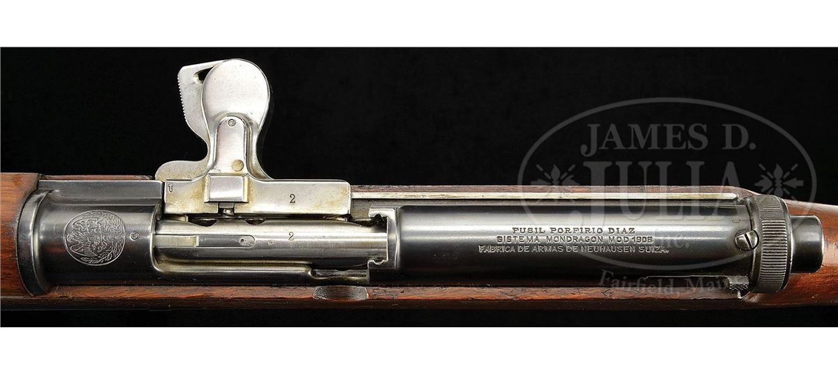 SN 2. Cal. 7.5 mm. Exceptional Swiss prototype of Mexican M1907 Mondragon Rifle in 7.5mm Swiss Caliber FOR Swiss Army tests. Ex-Henk Visser collection, ex-SIG factory collection. Bolt and receiver marked "2" with Swiss SIG factory “hammer” proofs, Mexican crest and "FUSIL PORFIRIO DIAZ SISTEMA MONDRAGON MODEL 1908 FABRICA DE ARMAS DE NEUHAUSEN A SUIZA". Bore is excellent. Trigger assembly is numbered "56". Comes with exceedingly rare factory fitted bipod. Additionally, includes an excellent condition and exceptionally rare Swiss-made Mexican shovel bayonet marked "HIERRO” (iron)to one blade, “MADERA” (wood) to the other and REPUBLICA MEXICANA". Once in a lifetime opportunity to obtain this unique Mondragon prototype with accessories. PROVENANCE: Collection of Dr. Geoffrey Sturgess, ex-Visser and SIG factory collections. CONDITION: Excellent. Overall condition of bolt and receiver is excellent retaining 98% of bluing. Stock has few scattered handling marks and scratches. 4-53244 DW15
