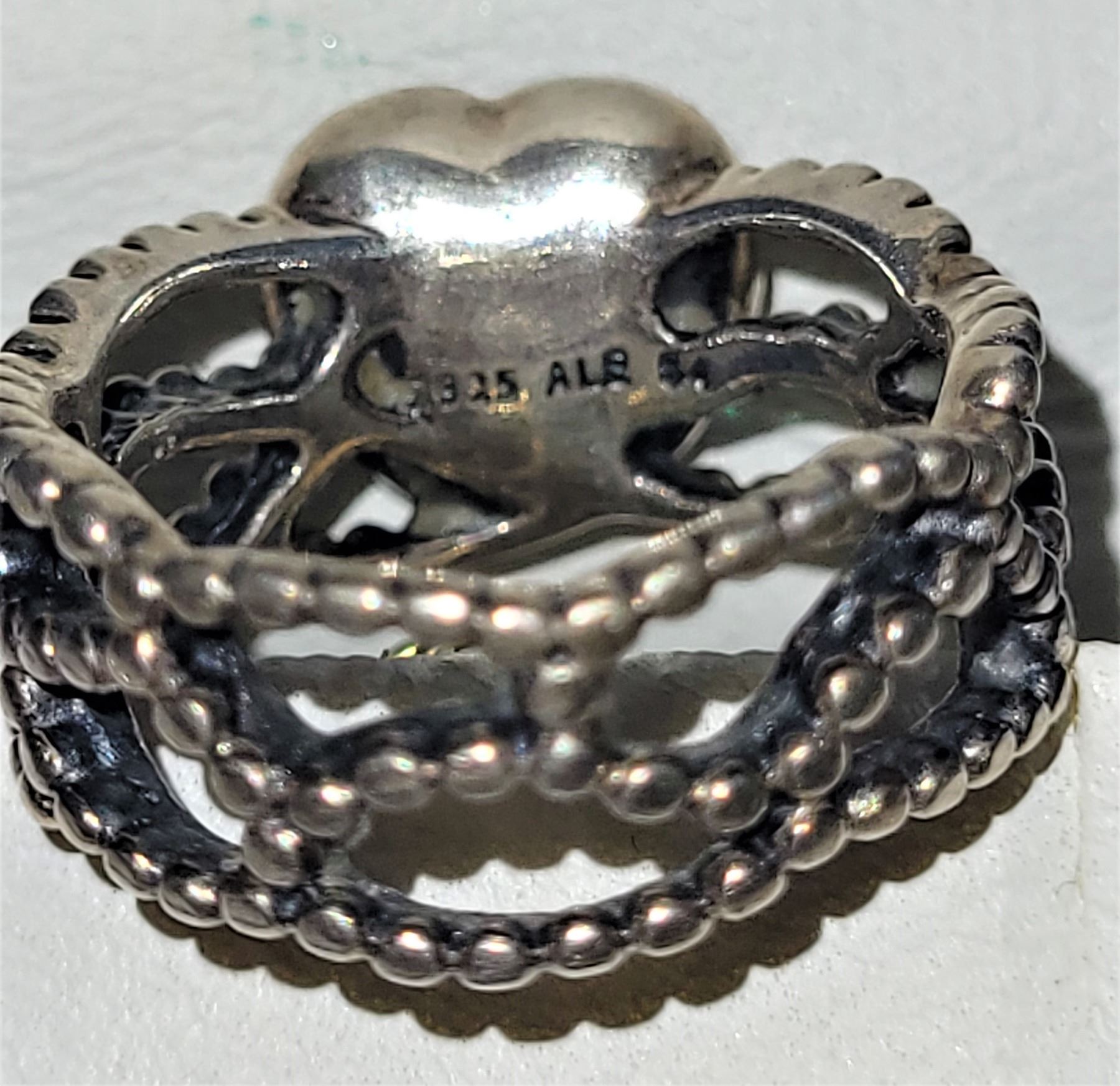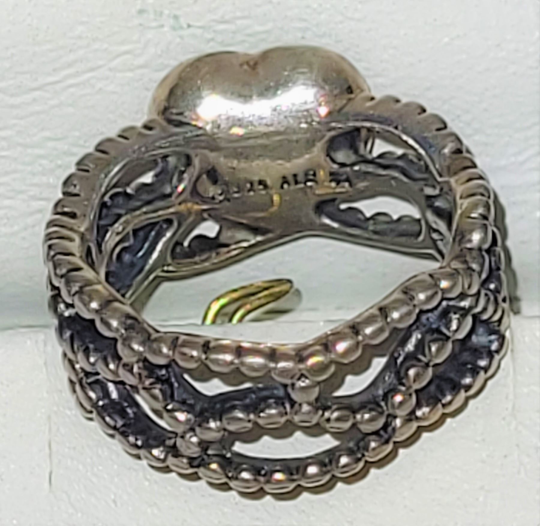 UNIQUE STERLING SILVER 925 WITH A DARK HEART SHAPED CENTRE STONE. APPROX SIZE 5. SEE PICTURES AND JUDGE FOR YOURSELF!