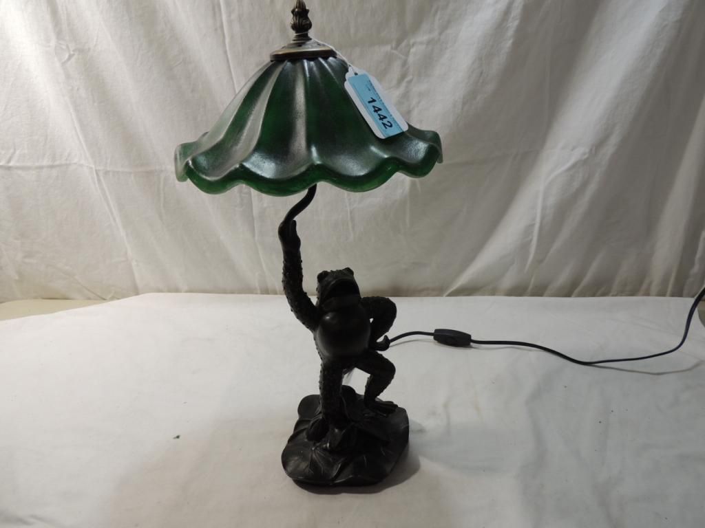 METAL POSSIBLY BRASS? FROG BASE WITH GLASS UMBRELLA SHADE. AS SHOWN SEE PHOTO FOR MORE DETAILS.