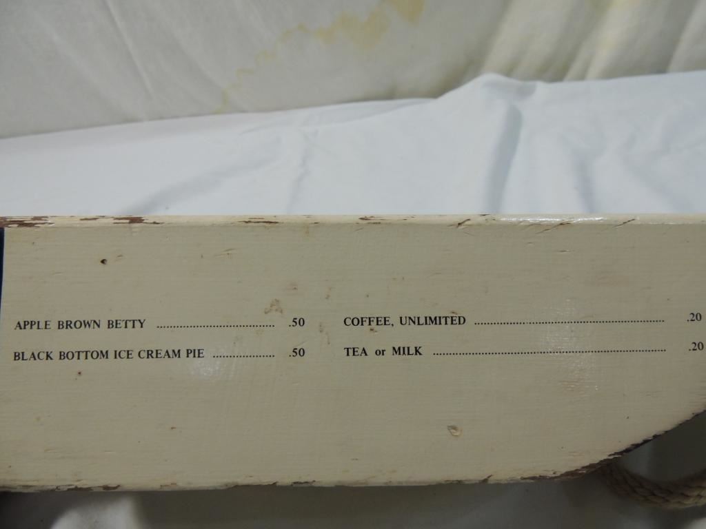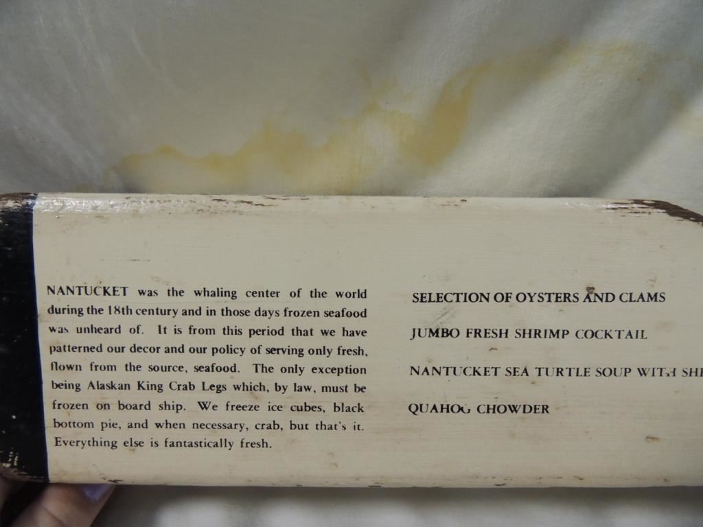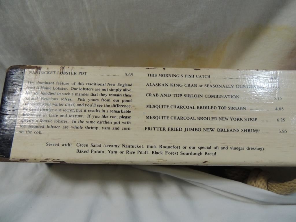 NANTUCKET LOBSTER TRAP MENU, WOODEN BOOIE WOODEN STOPPER UNQIUE VINTAGE MENU AS SHOWN SEE PHOTO FOR MORE DETAILS.
