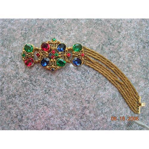 Brilliant and Beautiful Bracelet with sparkling red, blue, and green stones. Probable Czechoslovakia, vintage 1930's. Very unique and one of a kind! Measures 7 inches long by about 1 3/4 inches. This piece is not signed.