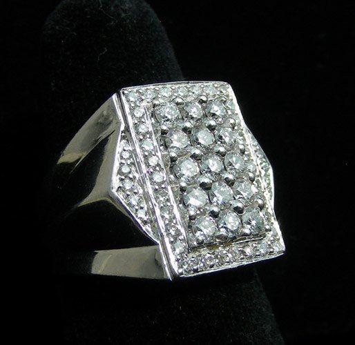 A wide hilghly polished white gold mount set with a rectangular section set with fine full cut round diamonds. Ring completed with smaller outside full cut round diamonds. Total diamond weight approx. 1.25 cts.