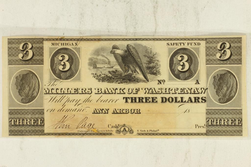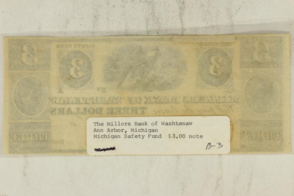 ANARBOR, MICHIGAN "MICHIGAN SAFTEY FUND" $3 NOTE, HAND SIGNED OBSOLETE BANK NOTE, UNC