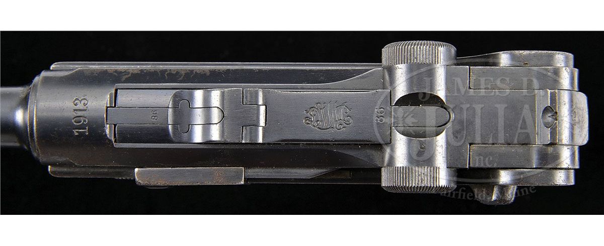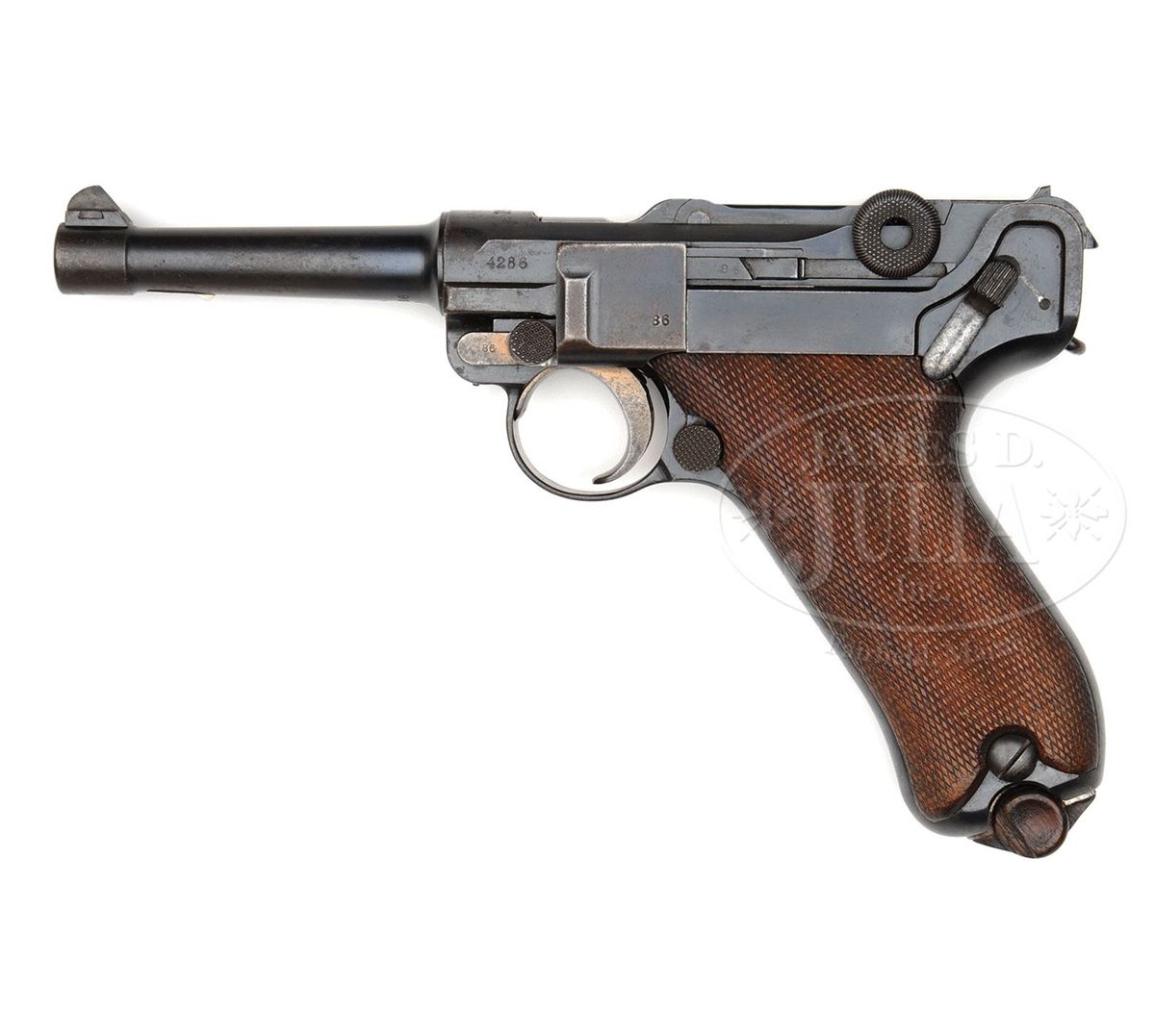 SN 4286a. 4" 9mm bbl. "DWM" scroll on middle toggle link. Imperial proofs on right receiver. No stock lug on frame. Unit marked "J.R. 418. 6K. 9." (418th Infantry Regiment, 6th Company, Weapon #9). All numbered parts on the gun are matching. Features of this gun appear on pp. 452, 485, 573, 626, 714, 1092, and 1101 of Dr. Geoffrey Sturgess' The Borchardt & Luger Automatic Pistols. Checkered walnut grips. Proper wood bottom magazine that does not match. PROVENANCE: Collection of Dr. Geoffrey Sturgess. CONDITION: Condition is fine. Retains 85% original blue and 35% original straw with light pitting overall. Grips are worn. Bore is sharp with frosting. Magazine has a large chip in the wood bottom. Mechanics are very good. 4-52922 BWS7