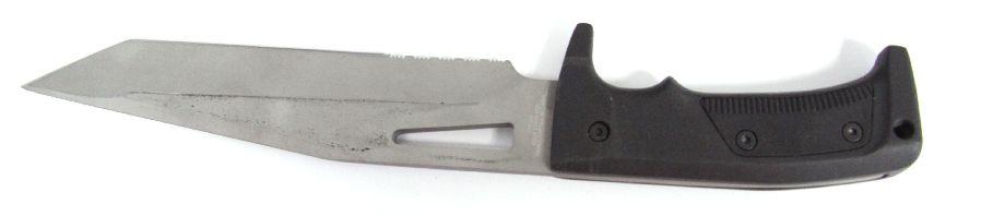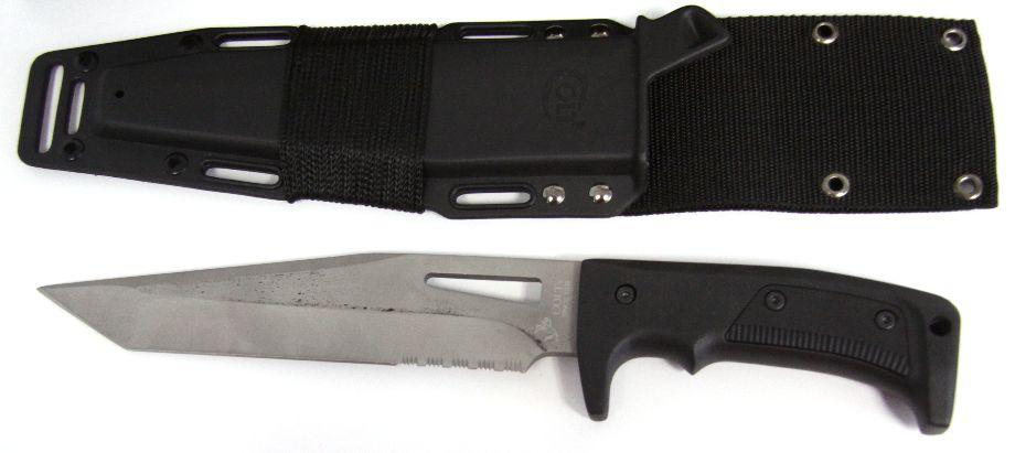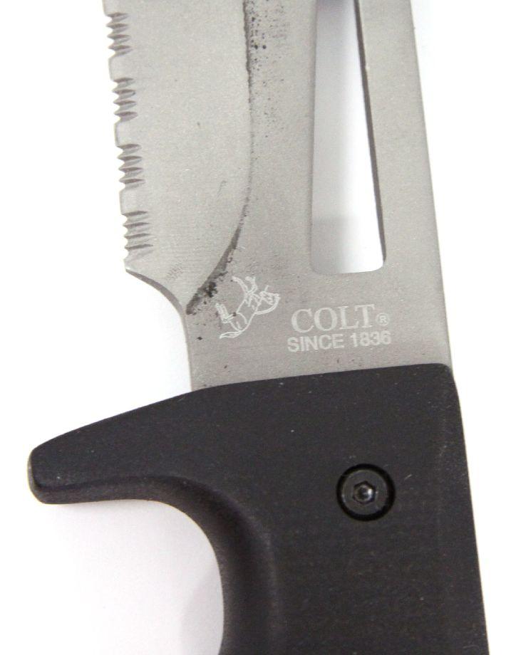 United Cutlery Colt Pathfinder tactical knife with scabbard. 8 inch blade, with grey powder coat finish, and black metal handle. Plastic tactical scabbard, nylon belt, and compass in case. As new, in original box.