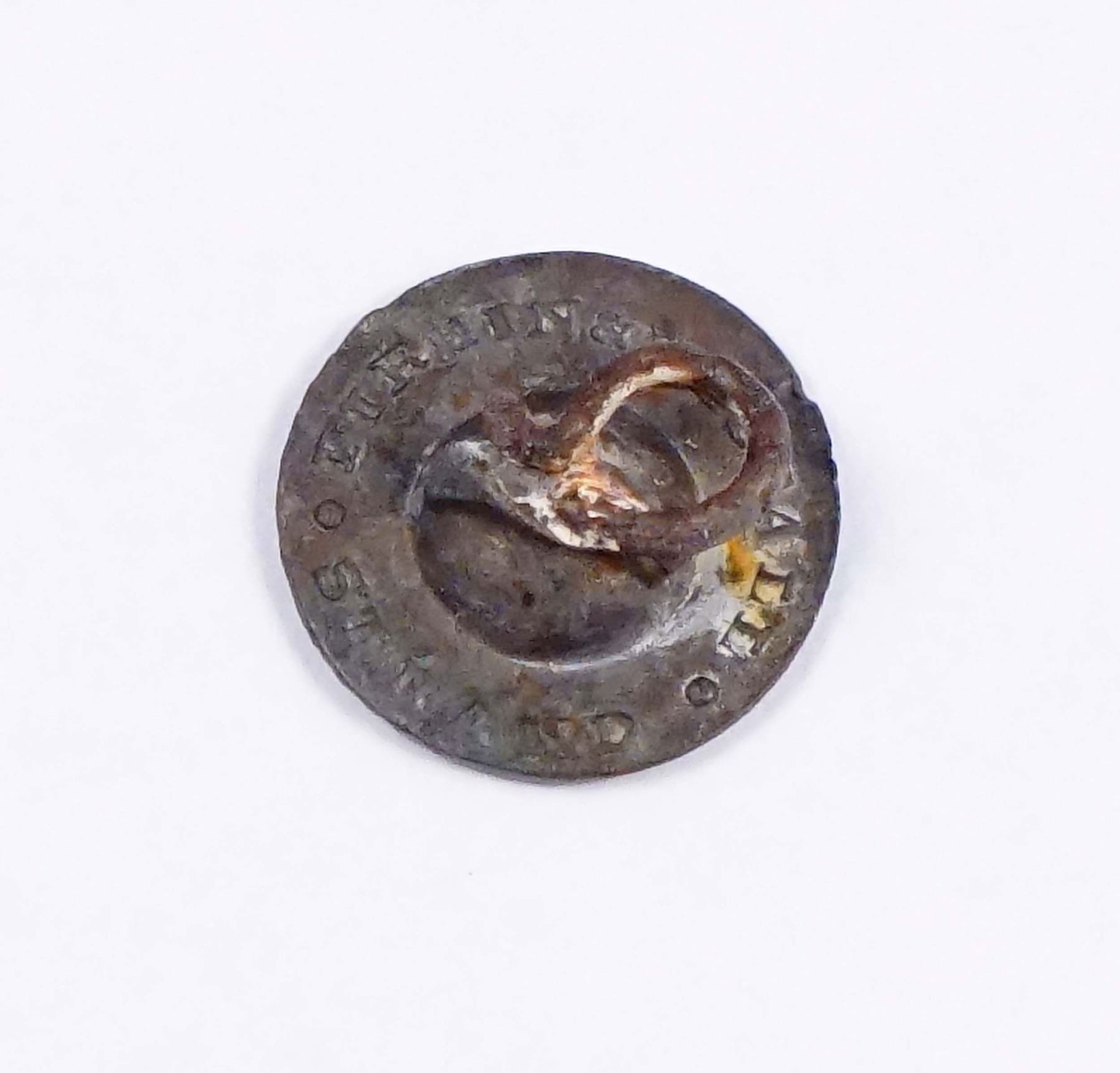 Very Rare, 2.2 gms. RAISED Hudson Bay Co. cypher within a Garter, Pro.Pelle.Cutem within the garter , topped with a seated fox looking left. Grades Very Fine as everything is legible but appears not to have been plated. The obverse has a die break and a cud between 5 and 6 O'clock, and the die may have been rusted as there are several dots left of the fox's nose. The First two letters of CUTEM are recut and larger than last 3 letters.The reverse is completely different from the first two buttons. The shank is mounted on a dome of metal, the left leg of the shank has pulled loose of the mount but the right leg is solid. The Shank is bent to a 90 degree angle and the writer would strongly suggest it not be leveled. It appears there was no plating on the reverse and all the lettering is clear.
