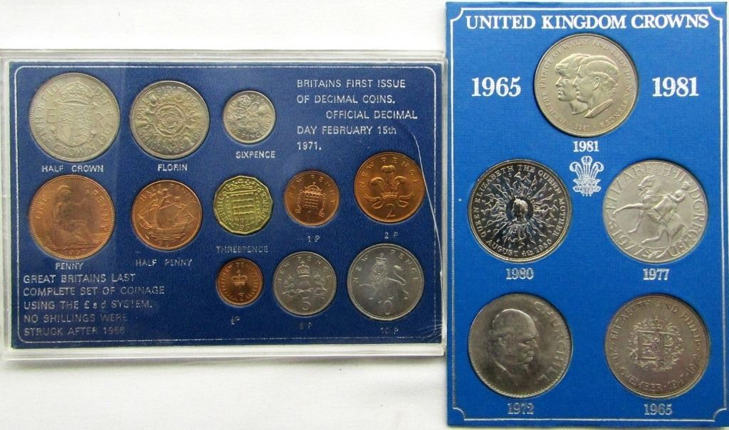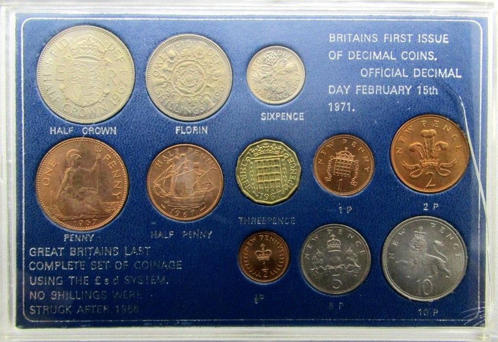 5 COIN SET in CARDBOARD HOLDER PLUS BRITAINS FIRST ISSUE OF DECIMAL COINS