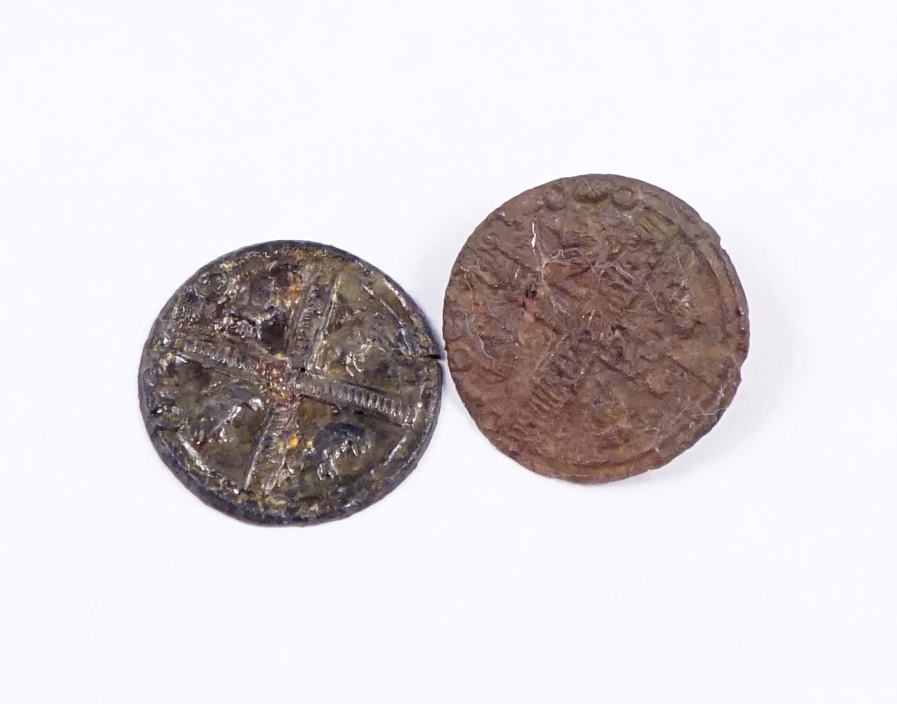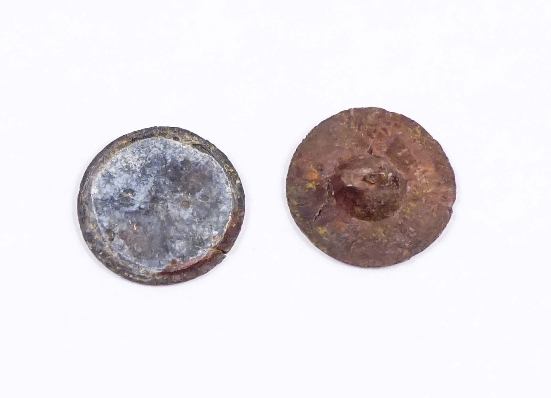 1 x 18 mm. 1.3 gms.w/domed reverse and broken shank and 17mm. .7 gms. Electotype . As in the lot prior, the writer feels these may have been prototypes for the development of the Hudson Bay Co. Logo. Should be viewed