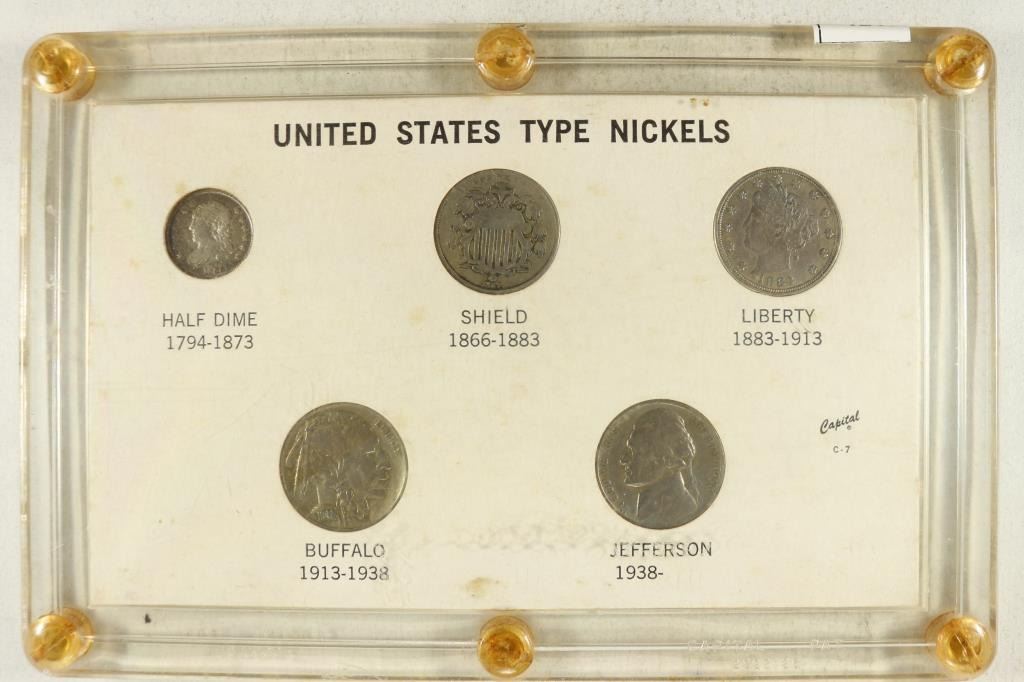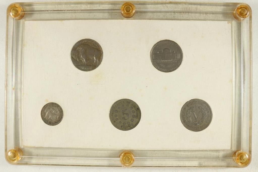 HOLDER, CONTAINS: 1835 CAPPED BUST HALF DIME, 1867 SHIELD NICKEL, 1883 NO CENT LIBERTY "V" NICKEL, 1938-D BUFFALO NICKEL AND 1938 JEFFERSON NICKEL. THE LIBERTY "V" NICKEL IS VERY FINE AND THE HALF DIME IS (FINE) 2021
