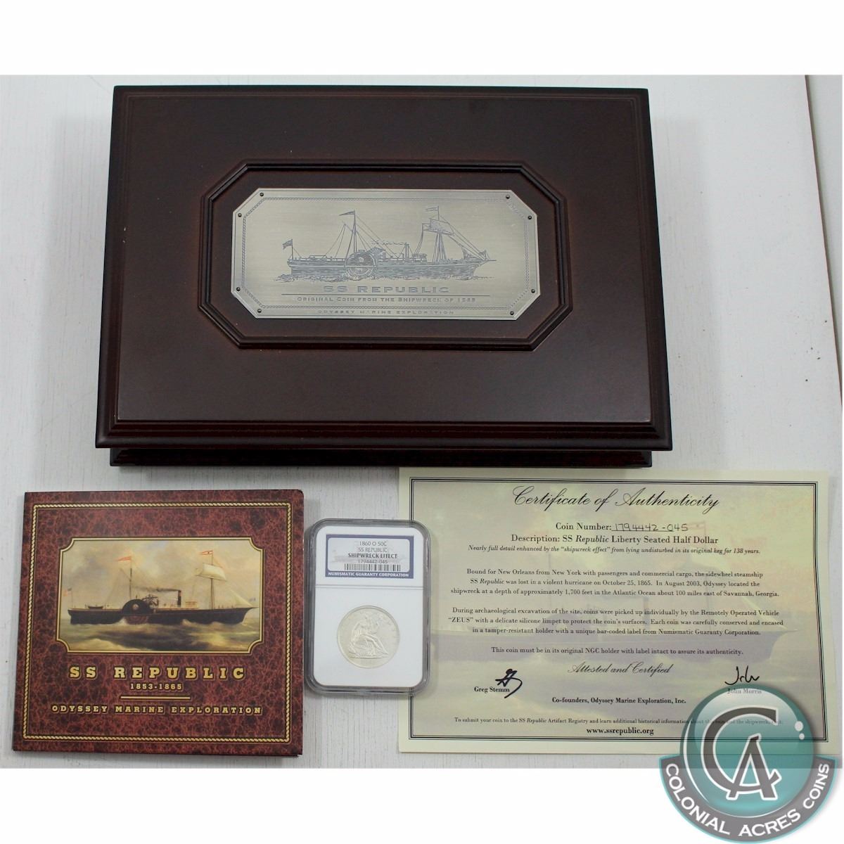 This coin was Minted at the New Orleans Mint in Louisiana, which was the only Southern Mint to survive the Civil War. The Dahlonega and Charlotte Mints ceased production of coins in 1861 when the States of Georgia and North Carolina left the Union and joined the Confederacy. They never Minted coins again. This silver coin has been Authenticated and Certified with a Shipwreck Effect by NGC and comes display in a Deluxe wooden display with its Certificate of Authentication.