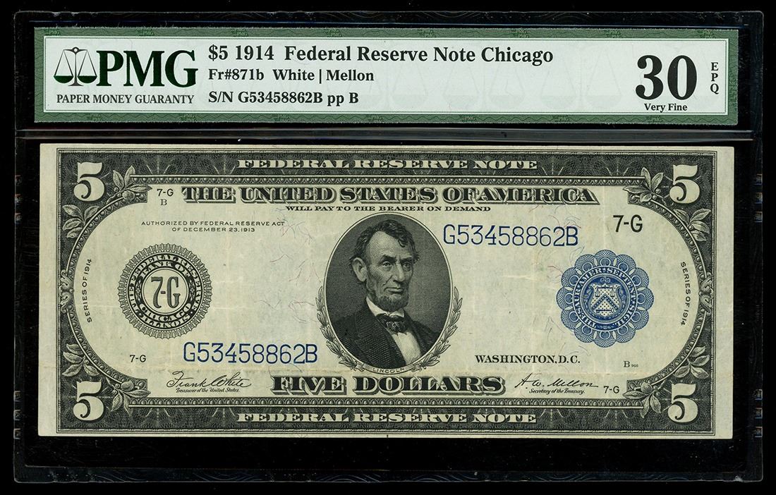 UNITED STATES, $5 Federal Reserve Note, series of 1914, serial G53458862B, White-Mellon, PMG VF 30 E