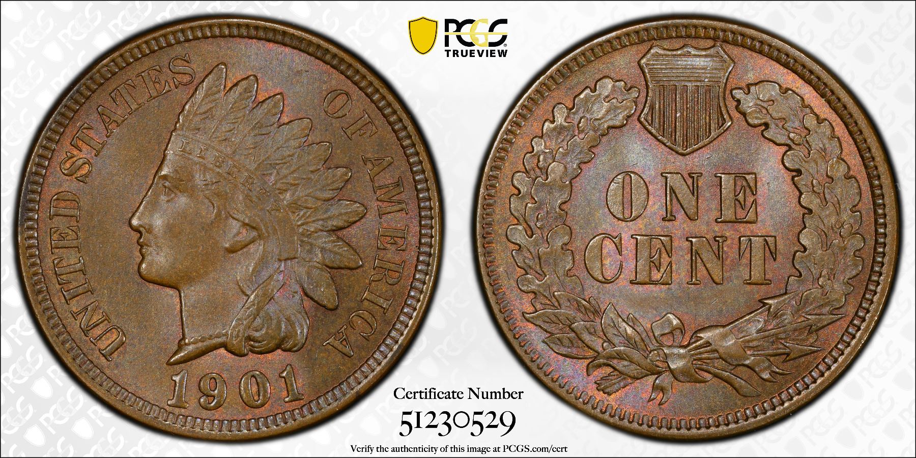 UNITED STATES: AE cent, 1901, KM-90a, Indian Head type, a superb lustrous example! PCGS graded MS65 BN.