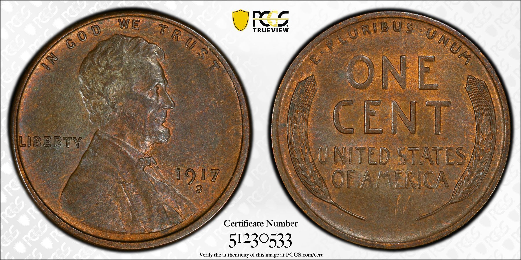 UNITED STATES: AE cent, 1917, KM-132, Lincoln type, a wonderful lustrous example! PCGS graded MS64 BN.