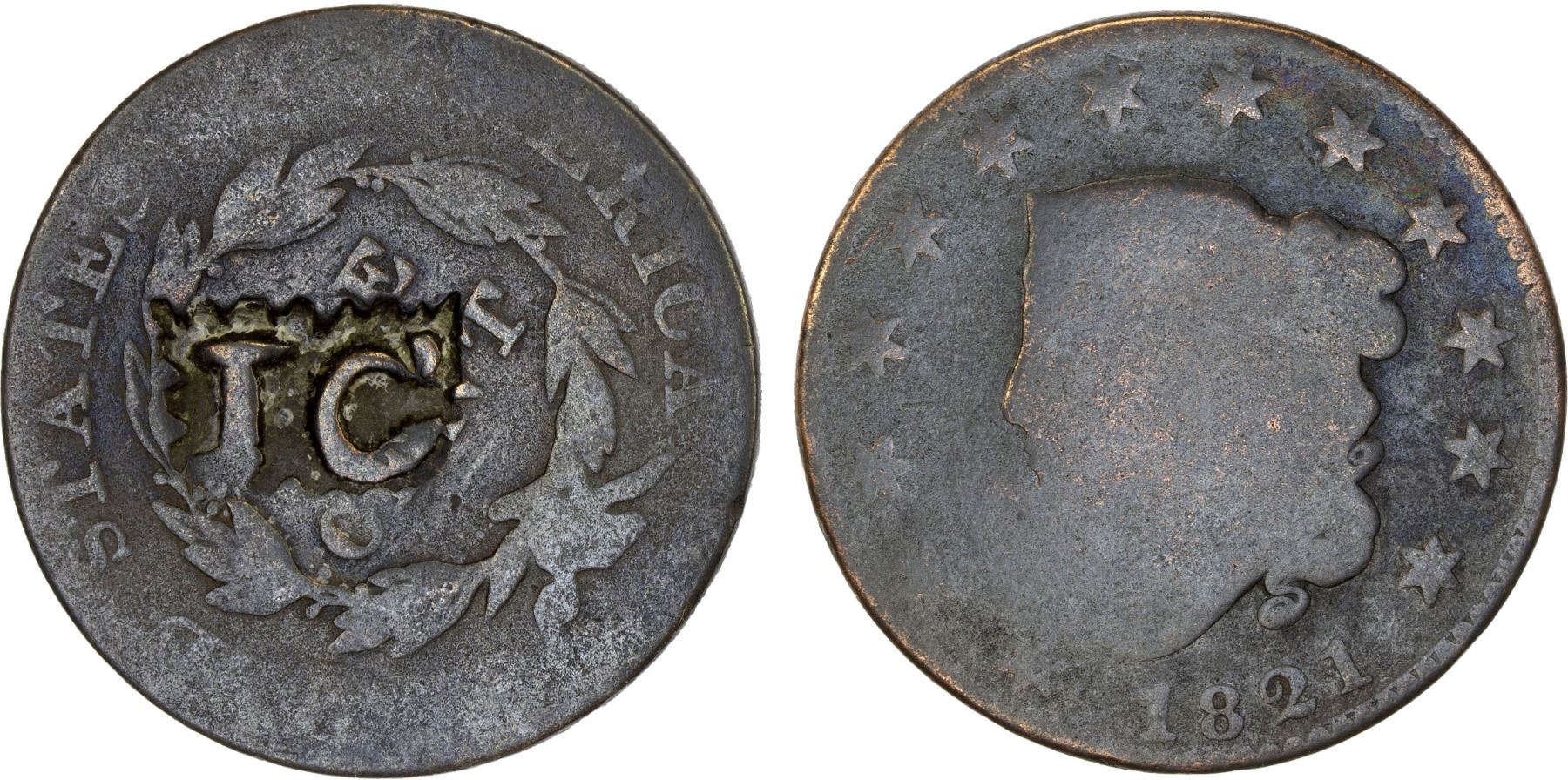 UNITED STATES: AE counterstamped cent, ND(1821), counterstamped J.C., Good.