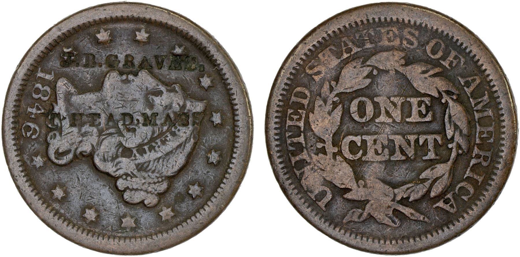 UNITED STATES: AE counterstamped cent, ND(1846), counterstamped J. R. Graves - G. (?) Head, Mass, About VF.