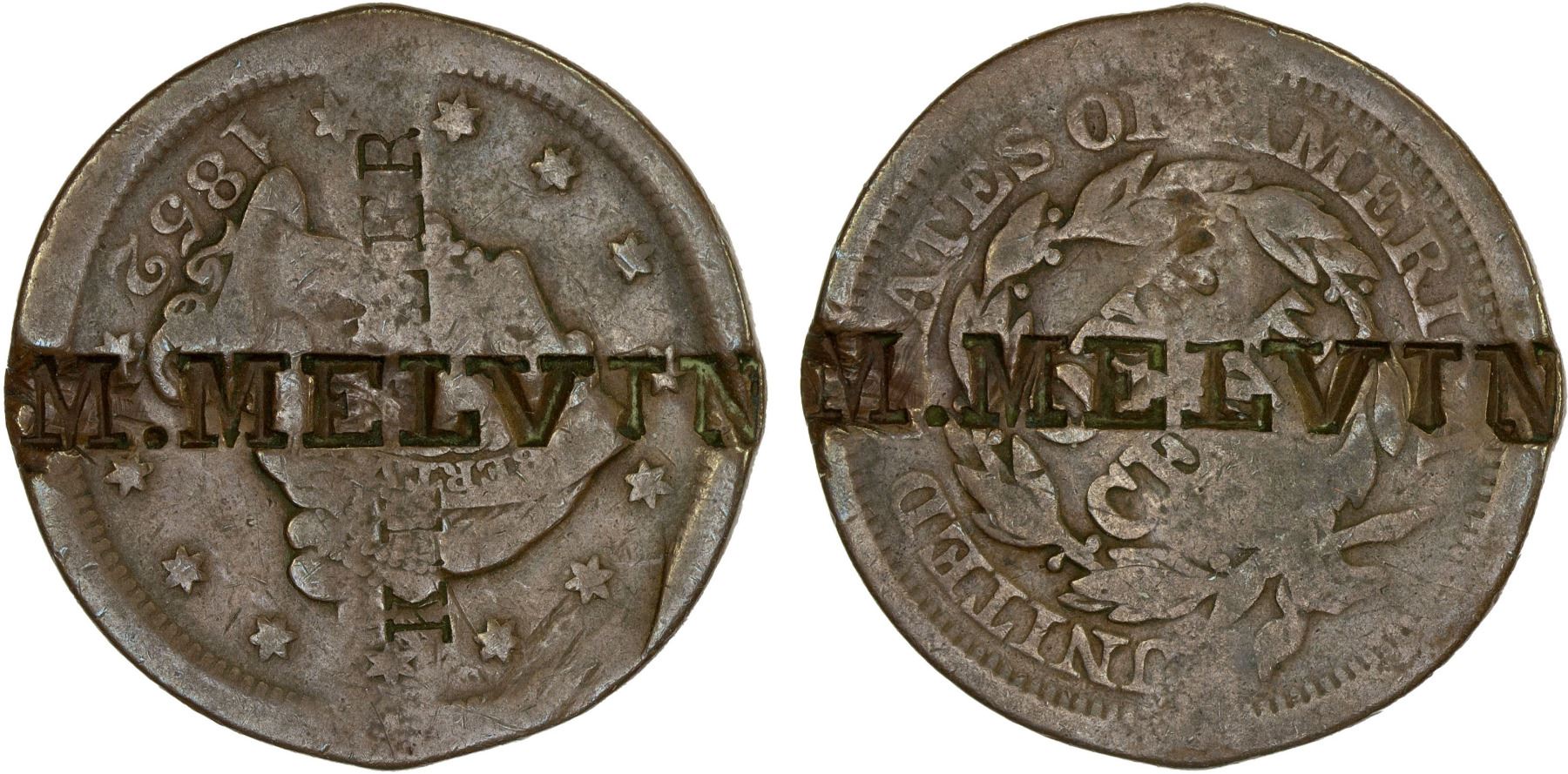 UNITED STATES: AE counterstamped cent, ND(1852), counterstamped M. Melvin, Fine.