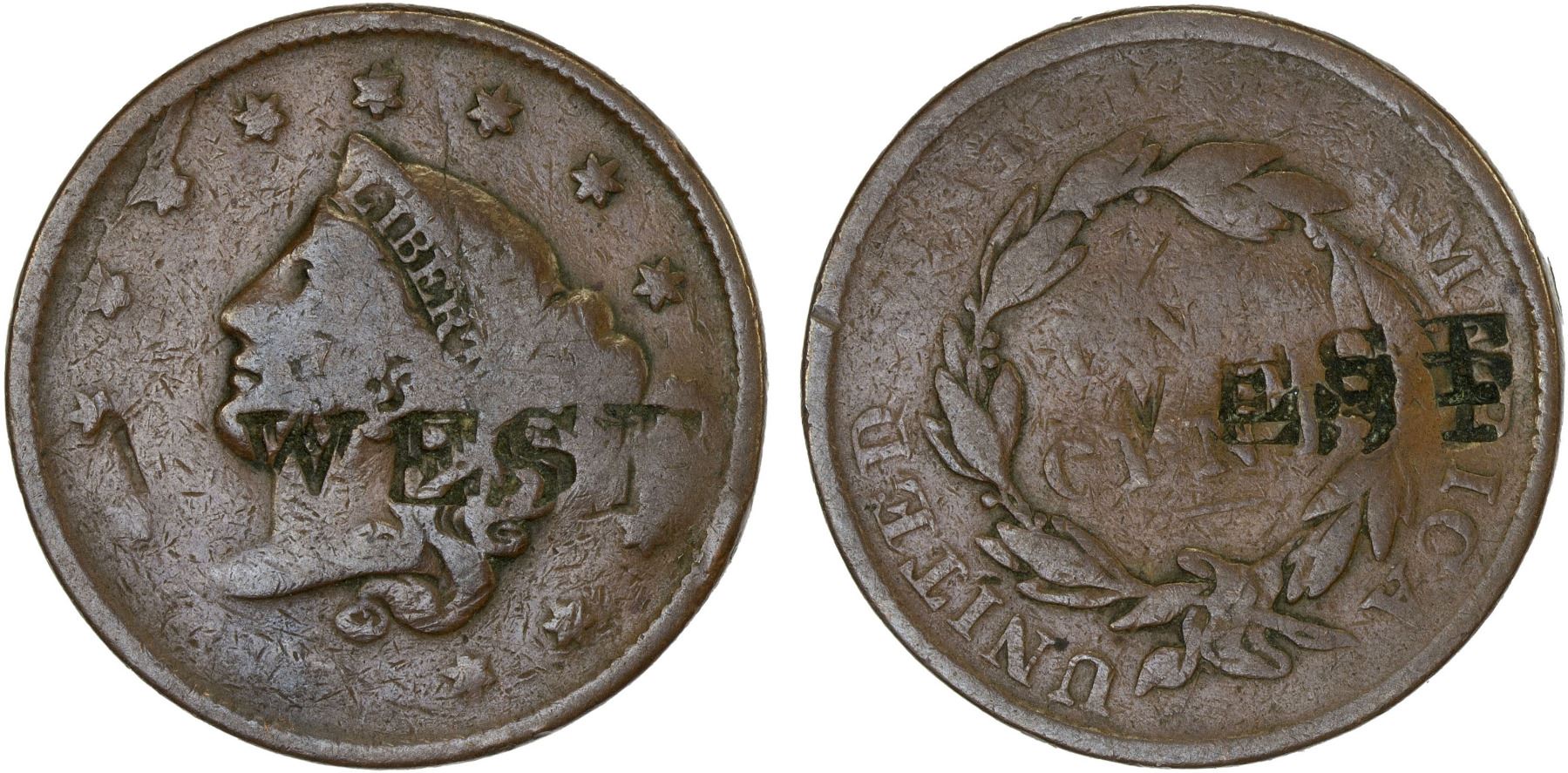 UNITED STATES: AE counterstamped cent, ND, A WEST countermark on Braided Hair large cent, Fine on worn host. In early 19th century United States, merchants utilized circulating coins as an advertising medium by applying countermarks – stamped or punched impressions – to them. These countermarks often included the merchant's name or initials, location, and type of business, providing a way for them to publicize their services and wares.