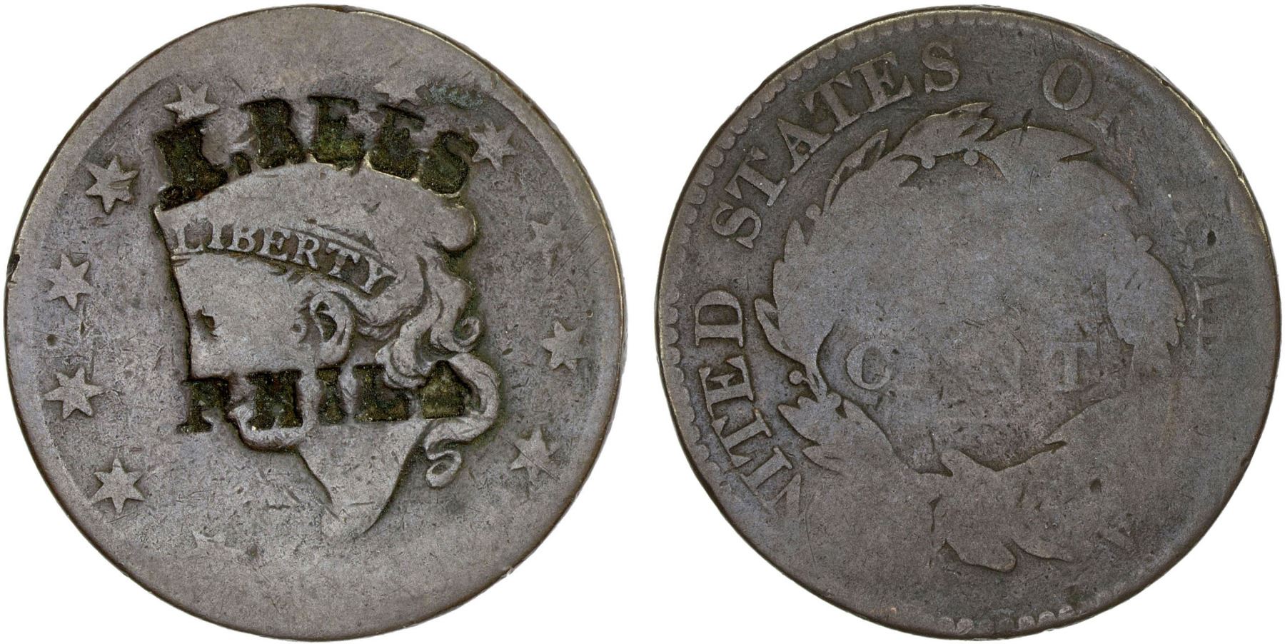 UNITED STATES: AE counterstamped cent, ND, K. REES / PHILA countermark in incuse rectangle on Coronet large cent, Fine on worn host. In early 19th century United States, merchants utilized circulating coins as an advertising medium by applying countermarks – stamped or punched impressions – to them. These countermarks often included the merchant's name or initials, location, and type of business, providing a way for them to publicize their services and wares.