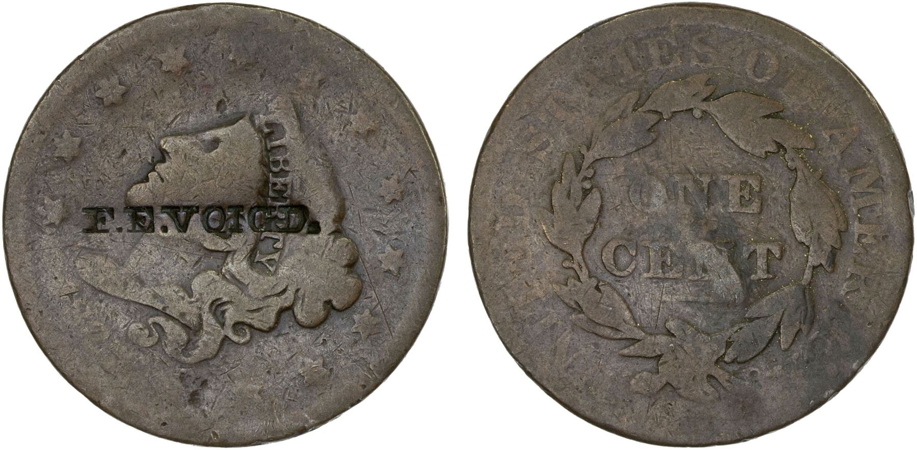 UNITED STATES: AE counterstamped cent, ND, F.E.VOIGD countermark on Braided Hair large cent, Fine on worn host. In early 19th century United States, merchants utilized circulating coins as an advertising medium by applying countermarks – stamped or punched impressions – to them. These countermarks often included the merchant's name or initials, location, and type of business, providing a way for them to publicize their services and wares.