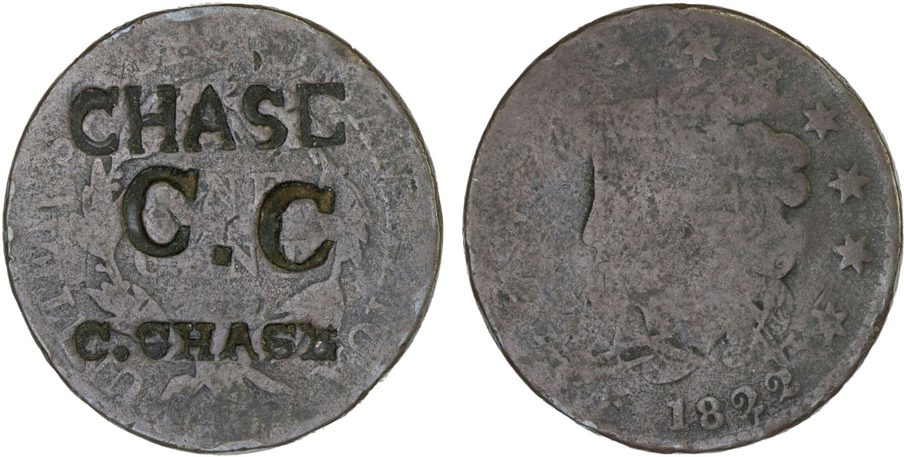 UNITED STATES: AE counterstamped cent, ND, CHASE / C. C / C. CHASE countermark on 1822 Coronet Head large cent, Fine on worn host. In early 19th century United States, merchants utilized circulating coins as an advertising medium by applying countermarks – stamped or punched impressions – to them. These countermarks often included the merchant's name or initials, location, and type of business, providing a way for them to publicize their services and wares.