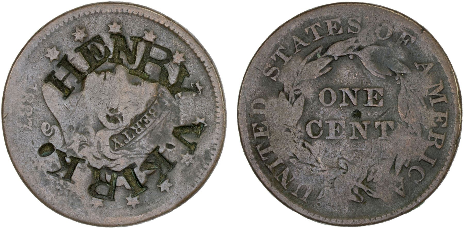 UNITED STATES: AE counterstamped cent, ND, HENRY V. KIRK countermark on 1837 Coronet Head large cent, VF on worn host. In early 19th century United States, merchants utilized circulating coins as an advertising medium by applying countermarks – stamped or punched impressions – to them. These countermarks often included the merchant's name or initials, location, and type of business, providing a way for them to publicize their services and wares.