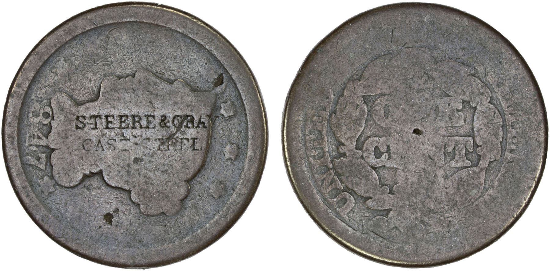 UNITED STATES: AE counterstamped cent, ND, STEERE & GRAY / CAST STEEL countermark on 1847 Braided Hair large cent, VG on worn host. In early 19th century United States, merchants utilized circulating coins as an advertising medium by applying countermarks – stamped or punched impressions – to them. These countermarks often included the merchant's name or initials, location, and type of business, providing a way for them to publicize their services and wares.