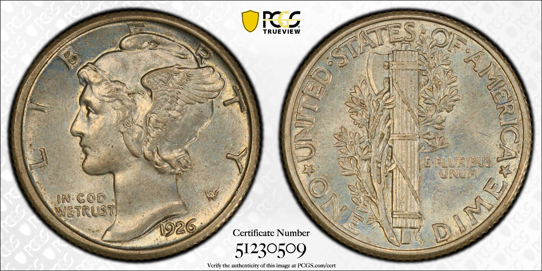 UNITED STATES: AR 10 cents, 1926, KM-140, Mercury Head type, a lovely lustrous example! PCGS graded MS63.