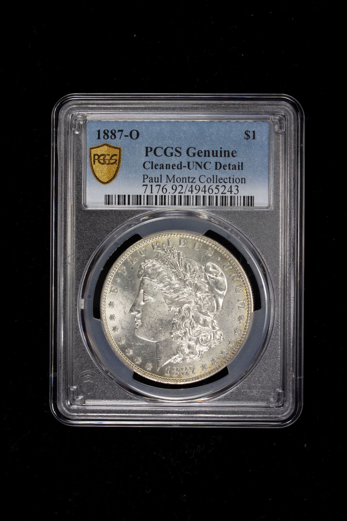 UNITED STATES: AR dollar, 1887-O, KM-110, Morgan type, cleaned, PCGS graded UNC details, ex Paul Montz Collection.