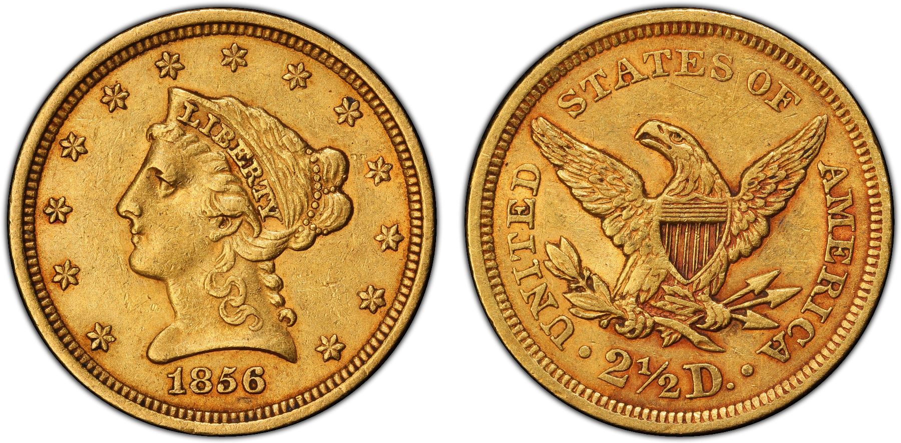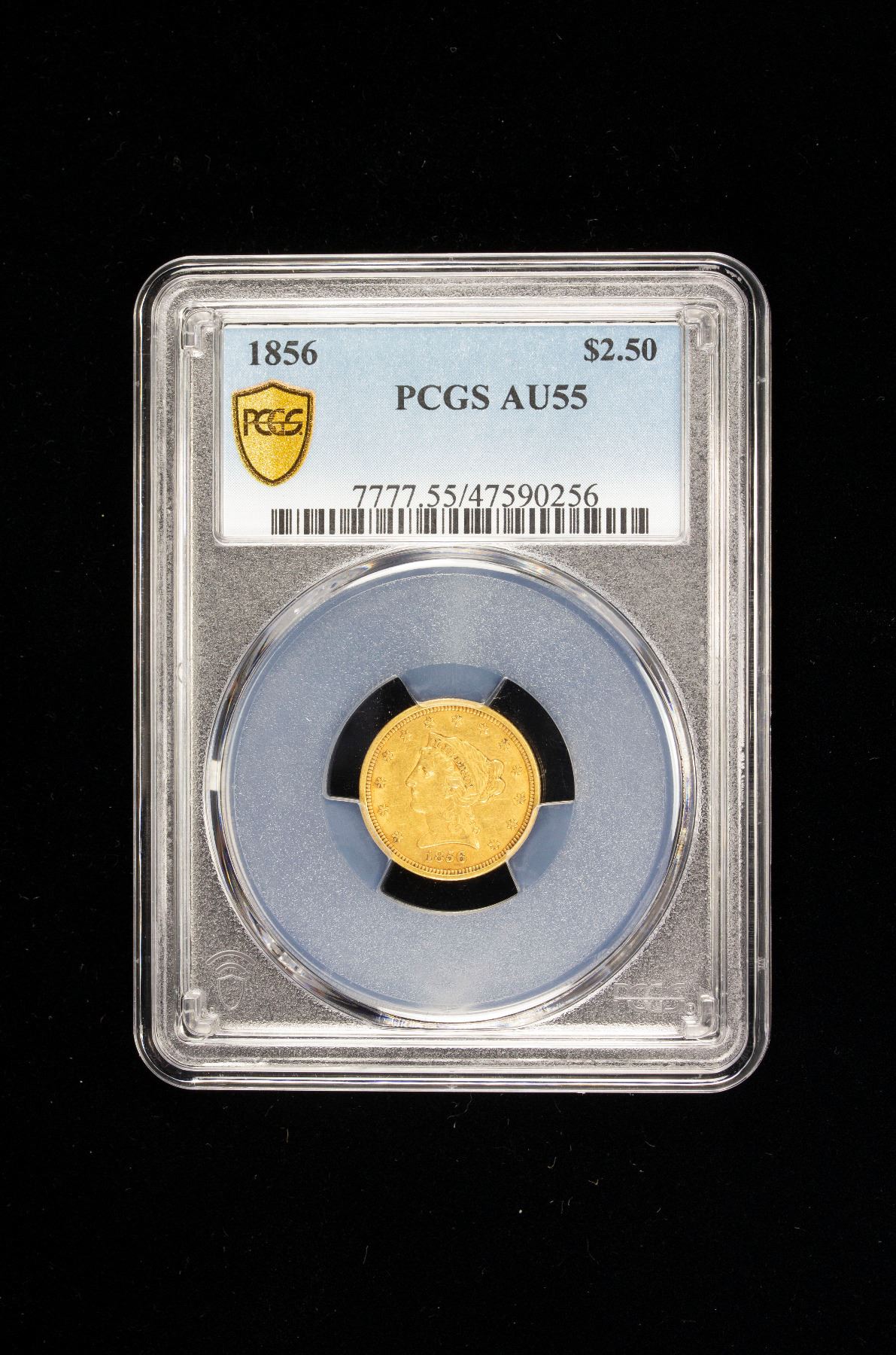 UNITED STATES: AV 2 1/2 dollars, 1856, KM-72, Coronet Head type, PCGS graded AU55.