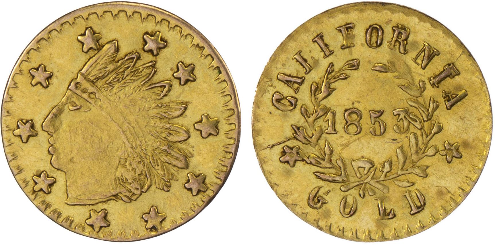 UNITED STATES: AV 25 cents (0.19g), 1853, California Fractional Gold, Indian type 1 with 10 stars, Burnie Type 2 round, Unc.
