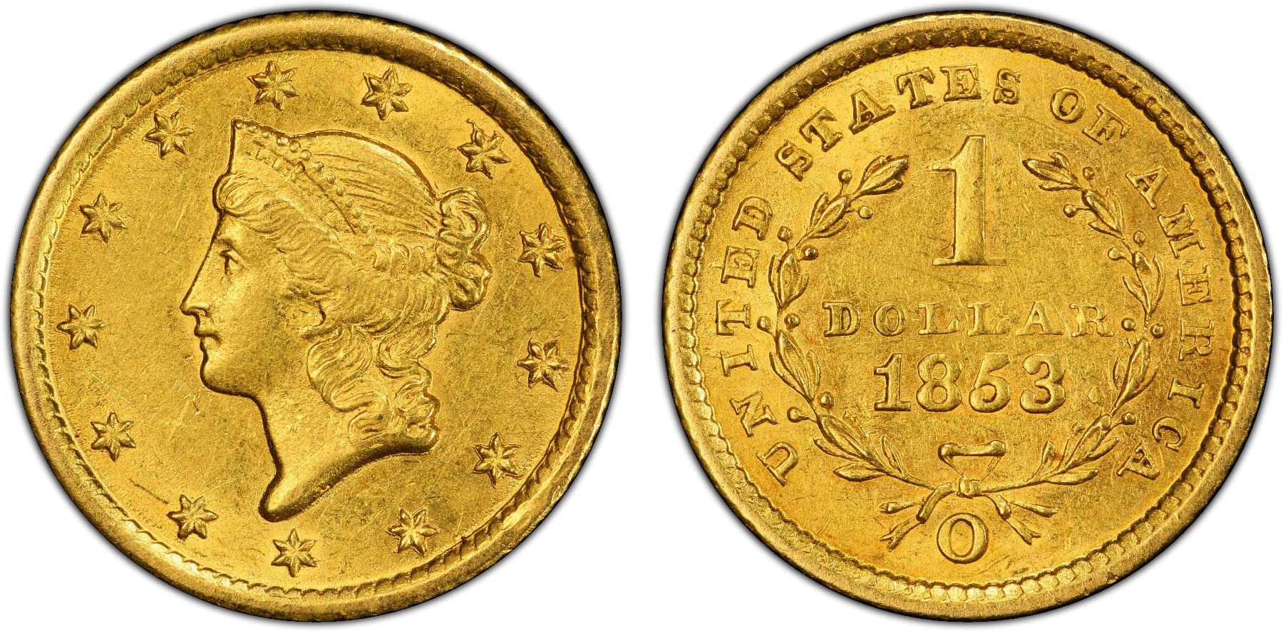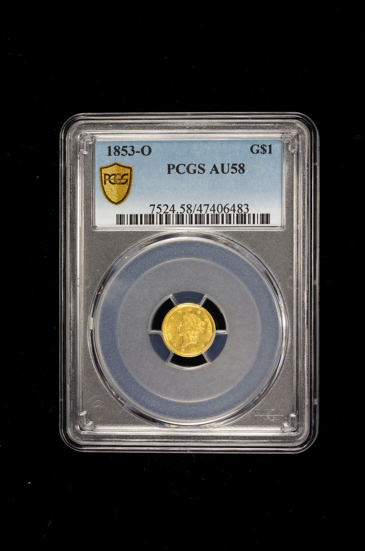 UNITED STATES: AV dollar, 1853-O, KM-73, Liberty Head type, an attractive lustrous nearly mint state example, PCGS graded AU58.