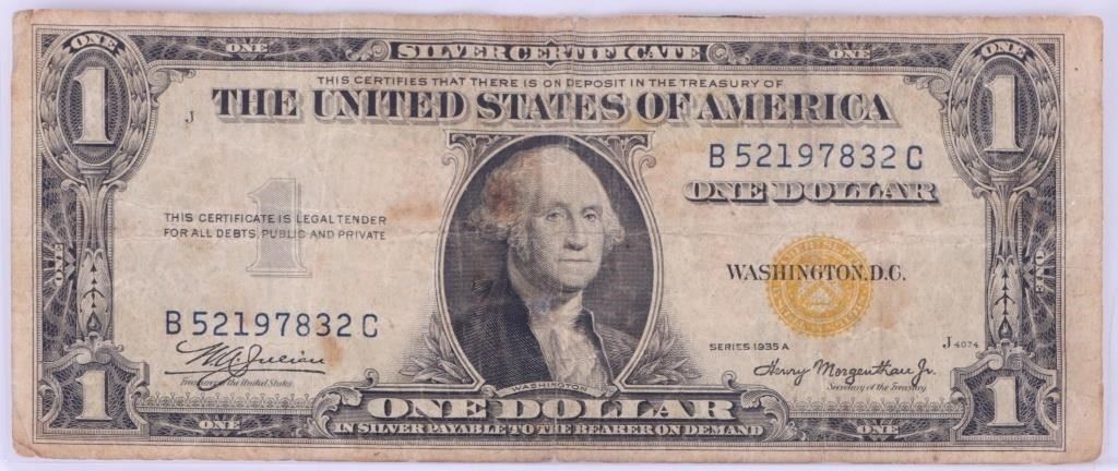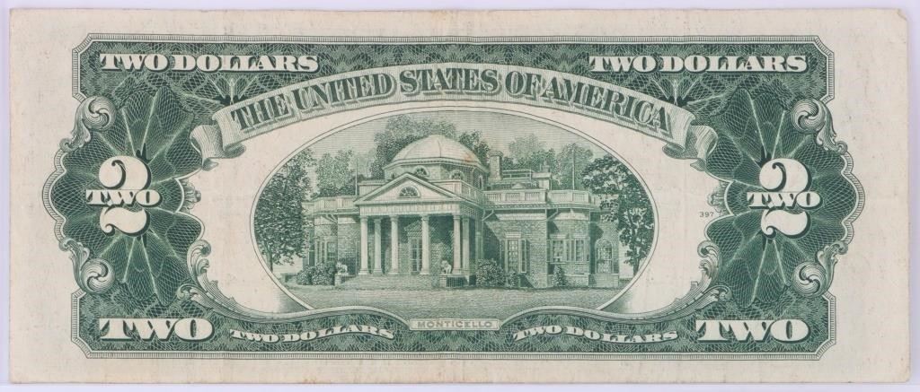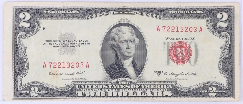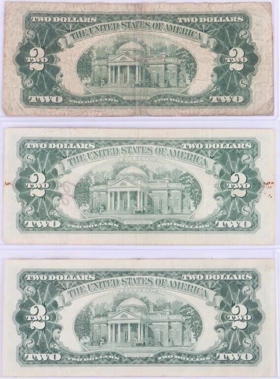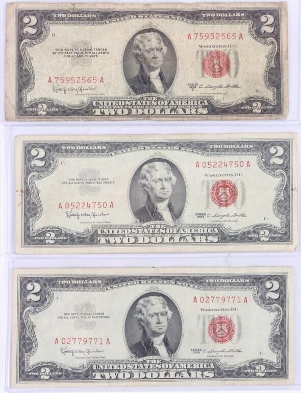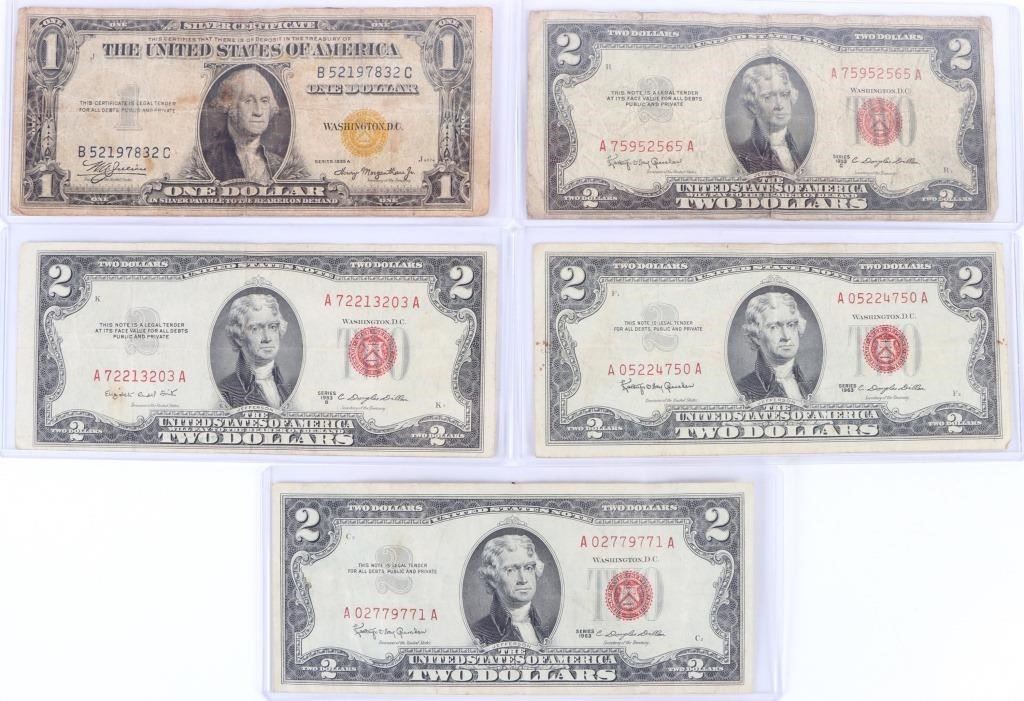 United States currency lot of 5 to include: Two 1953 series red seal $2 note, two 1963 red seal $2 note, 1935 $1 North Africa gold seal silver certificate.