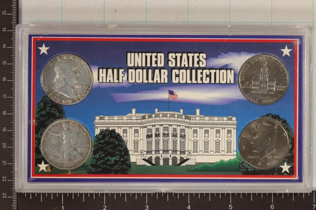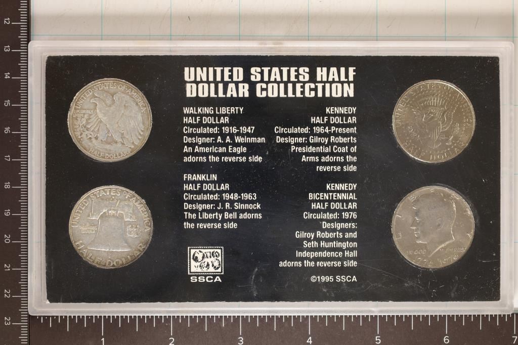 SILVER WALKING LIBERTY HALF DOLLAR, 1963-D SILVER FRANKLIN HALF DOLLAR, BICENTENNIAL 1976 AND 1995-P KENNEDY HALF DOLLARS. IN HARD PLASTIC CASE